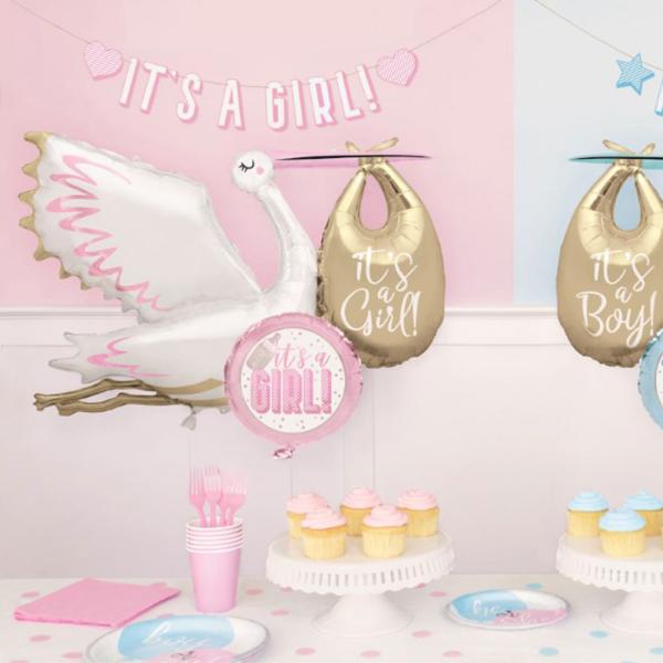 Storken ankommer snart med en lille baby pige i sit knyt, og det skal selvfølgelig fejres med baby-shower eller gender-reveal! Denne fine og store stork ballon er perfekt som dekoration til baby-shower og gender-reveal, et must for alle, der ønsker en fest og tema tilbehør ud over det sædvanlige.