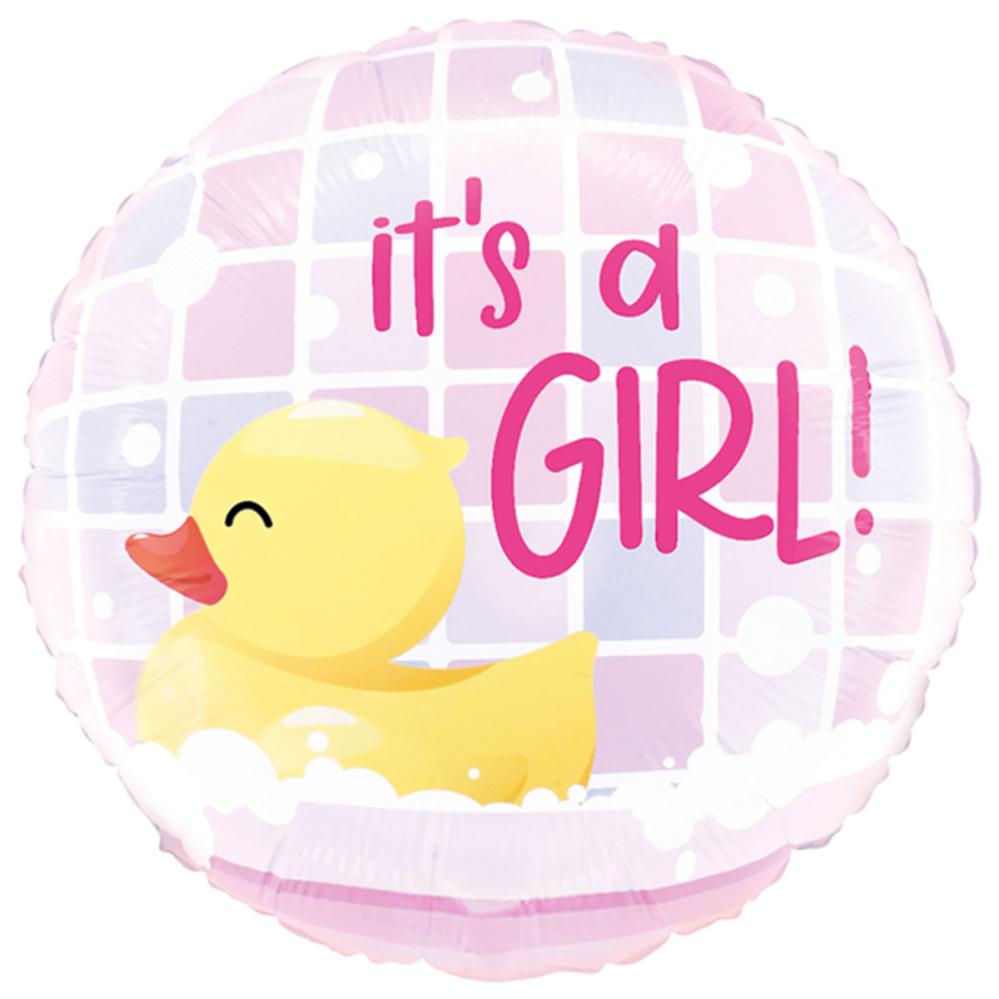 It's a Girl med Badeand Rund Folieballon omfatter en rund ternet folieballon i lyserød, lilla og hvid, dekoreret med teksten "it's a GIRL!" i lyserød og en gul badeand.