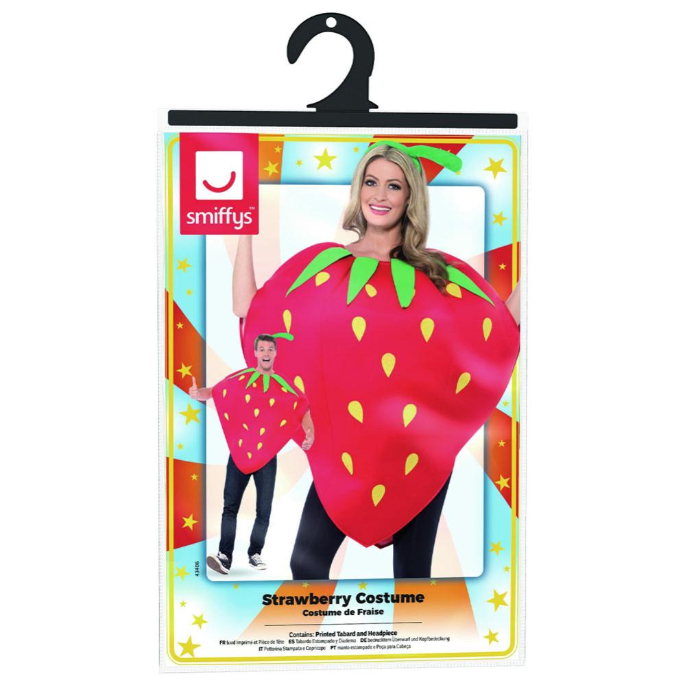 Jordbær Kostume omfatter en supersød dragt i form af et jordbær, som nemt trækkes over hovedet. Der medfølger også et diadem med en grøn stilk.
