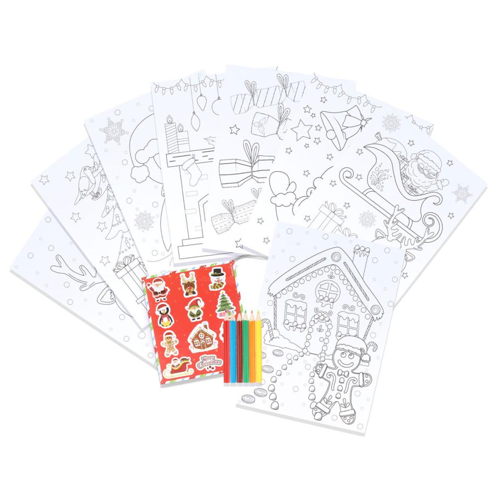 Et julefarvelægningssæt med otte detaljerige A4-ark og seks farveblyanter i festlige farver gør det nemt at lave sit eget julepynt. Det er et perfekt juletegnesæt, som alle børn elsker, komplet med klistermærker til ekstra dekoration.