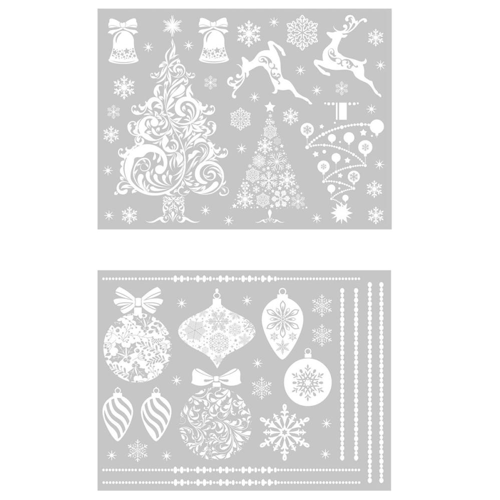Jul Vinduesklistermærker Hvid omfatter to store ark med hvide vinduesdekorationer som har forskellige julemotiver.