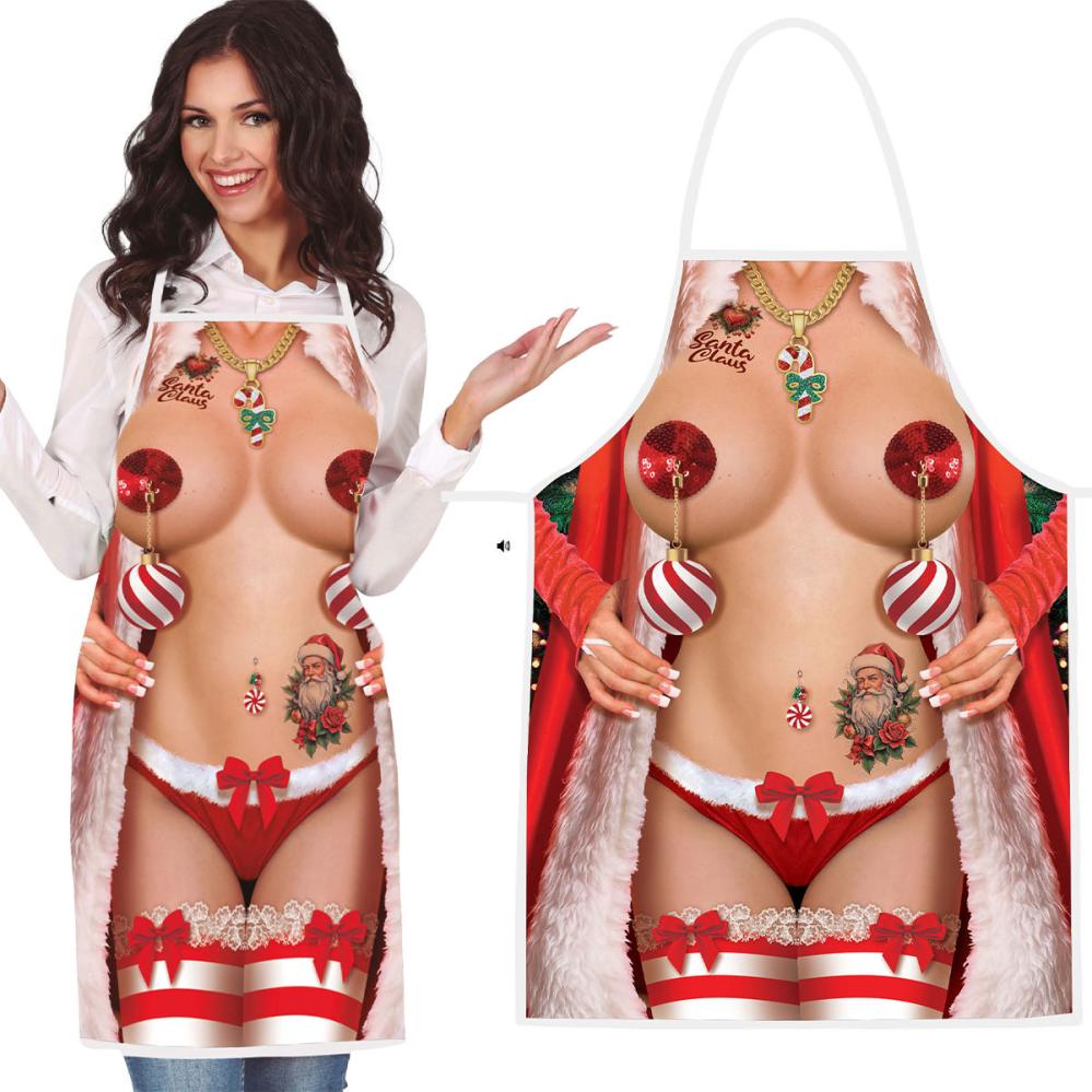 Juleforklæde Nøgen Kvinde omfatter et sjovt og iøjnefaldende juleforklæde med et realistisk fototryk af en kvindekrop iført juleundertøj og dekoreret med festlige juledetaljer.