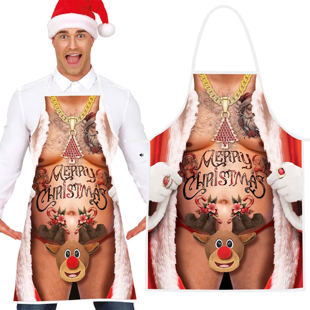 Juleforklæde Nøgen Mand er et humoristisk juleforklæde med tryk af en nøgen mand, dekoreret med en "Merry Christmas"-tatovering, en guldkæde, rensdyrmotiv og en åben julemandsjakke.