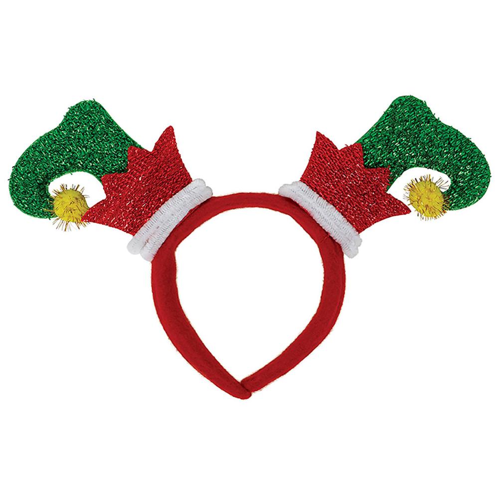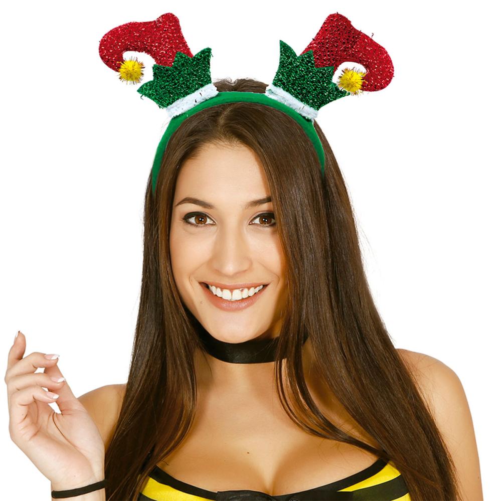 Julehårbøjle Elversko omfatter en grøn hårbøjle med opstikkende elversko i rød, grøn og hvid.