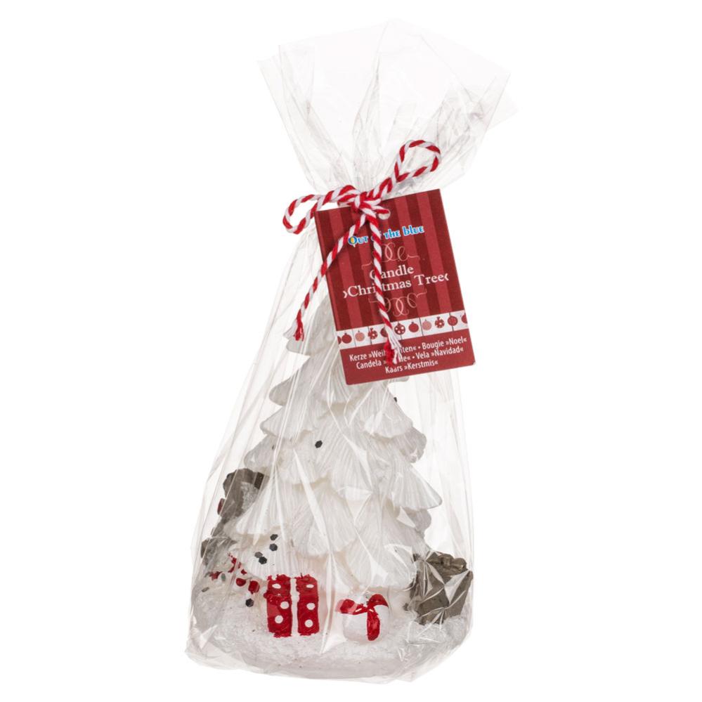Julelys Juletræ Hvidt inkluderer et lys i form af et hvidt juletræ med pakker, bamse og pebermynte under i rødt, gråt og hvidt. Lyset er ca. 14,5 cm højt og 9 cm i diameter. Lyset kommer i transparent cellofanplast med rødt og hvidt snor.