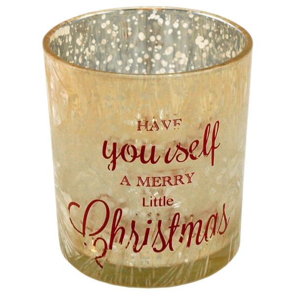 Julelys Lanterne omfatter en frostet lanterne i guld med teksten "Have Yourself A Merry Little Christmas" i rødt. Lanterne er lavet af glas og måler ca. 10 x 9 cm.