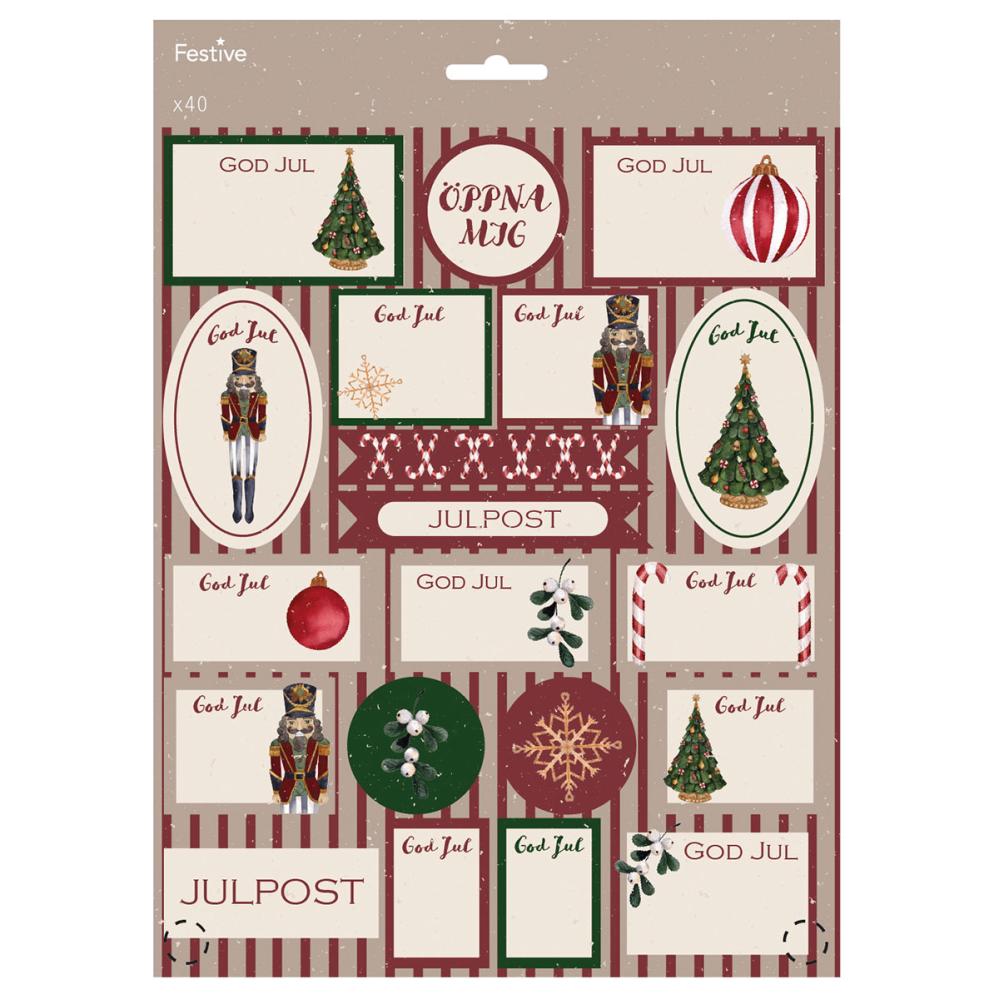 Julemærker 40-pak indeholder to ark med forskellige juleetiketter i hvid, grøn og rød. Hvert ark har 20 juleetiketter.