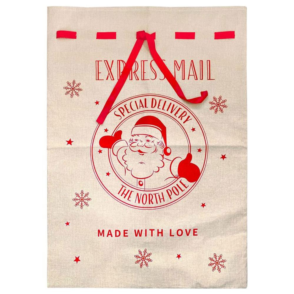 Julemand Julesæk Jute omfatter en julesæk i jutestof, dekoreret med en julemand, snefnug og stjerner samt røde juletekster. Sækken har et rødt bånd til at snøre åbningen til.
