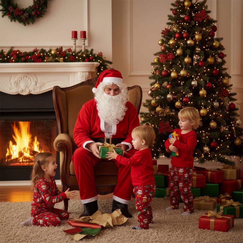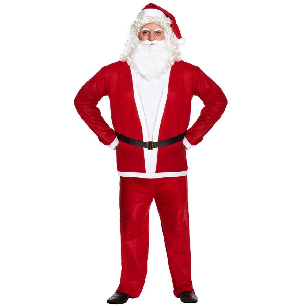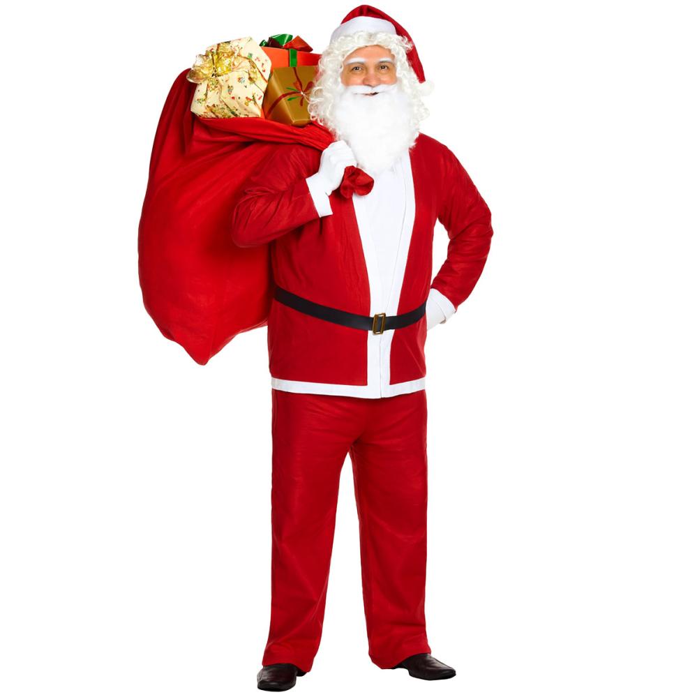 Julemandsdragt Klassisk omfatter en fløjlsagtig julemandsdragt i rød og hvid, som indeholder en jakke, et par bukser, et sort bælte med et gyldent spænde, en julemandshue og et julemandsskæg med tilhørende overskæg.