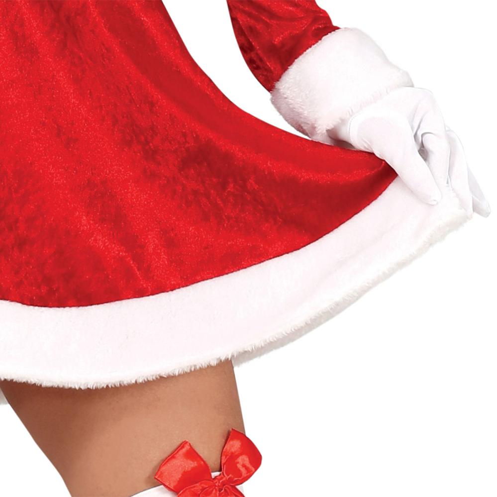 Julemor Julekostume Fløjl omfatter et julekostume i rød og hvid med en nissehue, et sort taljebælte med guldspænde og en kort julekjole med lange ærmer.