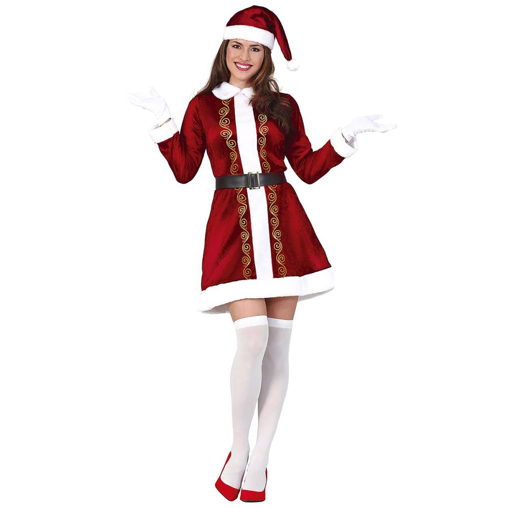 Julemor Julekostume Mørkerød er et julekostume i mørkerød og hvid. Dragten indeholder en kort kjole med guldfarvede detaljer, et sort taljebælte med guldspænde og en nissehue.