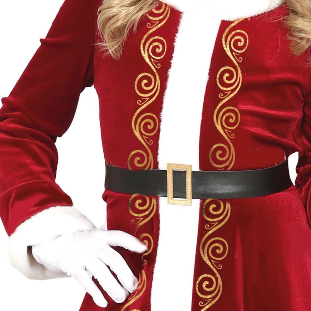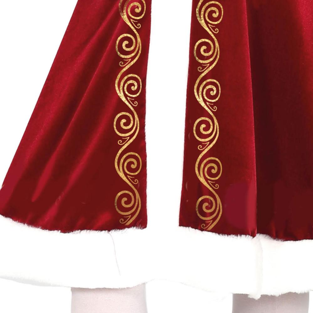 Julemor Julekostume Mørkerød Børn er en børnedragt med julemotiv i mørkerød og hvid. Dragten indeholder en kort kjole med guldfarvede detaljer, et sort taljebælte med guldspænde og en nissehue.