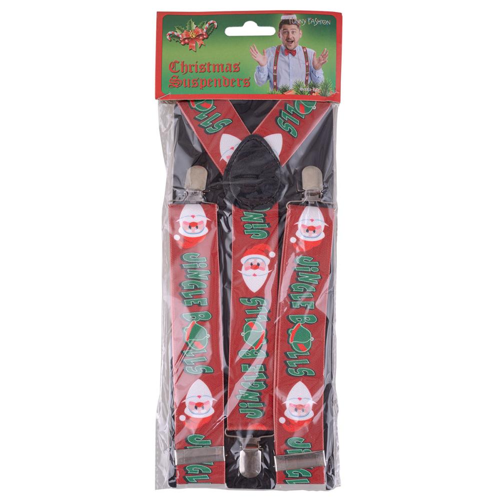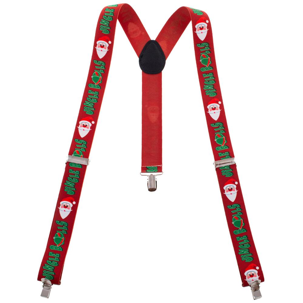 Juleseler Jingle Bells er røde justerbare seler som har sølvfarvede metalspænder og er dekoreret med nissehoveder, grønne juleklokker og teksten "JINGLE BELLS" i grønt.