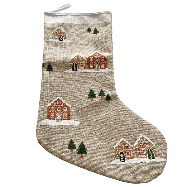 Julestrømpe Grantræer/Hus er en beige julestrømpe i jutevæv med hvid kant foroven, dekoreret med grantræer og huse. Julestrømpen har en hvid løkke til ophængning.