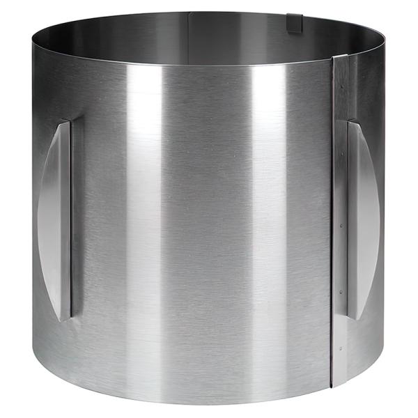 Justerbar Kagering Høj omfatter en rund kagering med justerbar størrelse og uden bund. Kan også bruges som kageform til bagning af runde, høje kager. Kantens højde er ca. 20 cm, og diameteren kan justeres fra 18-32 cm. Formen er lavet af rustfrit stål og tåler opvaskemaskine. Brug sammen med bagepapir eller lignende.