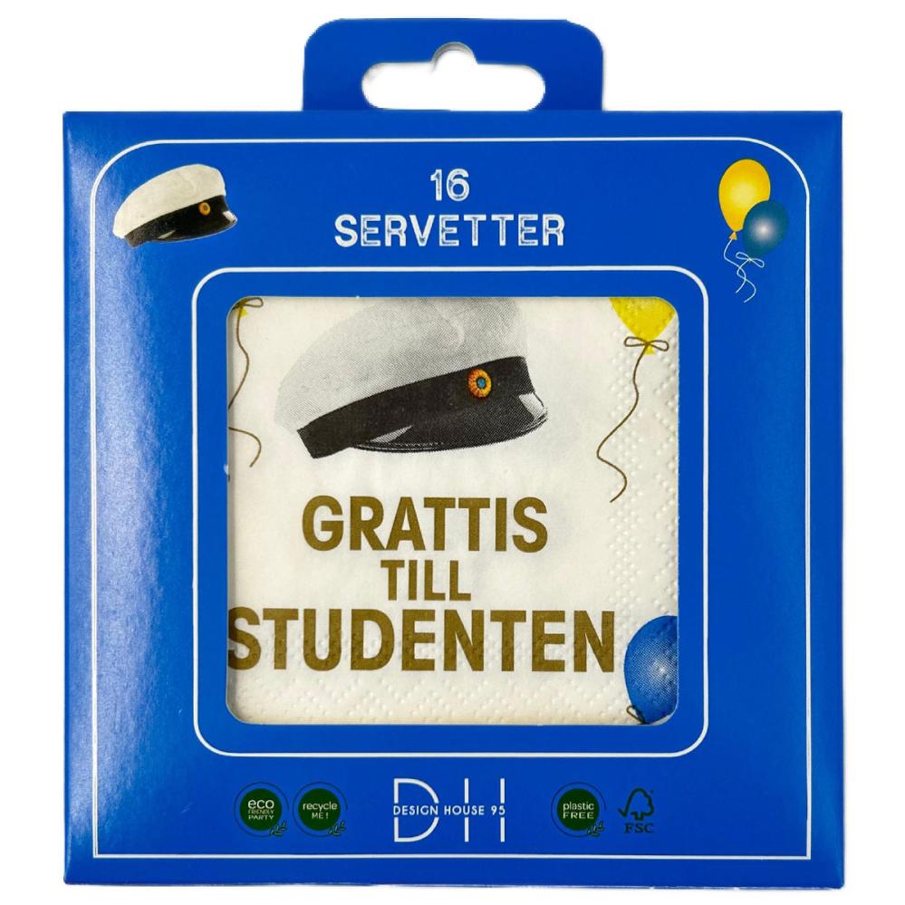 Kaffeservietter Grattis Till Studenten 25 cm 16-pak indeholder seksten hvide engangsservietter i tre lag, dekoreret med teksten "GRATTIS TILL STUDENTEN" i guldfarve, en klassisk studenterhue samt balloner i gult og blåt.