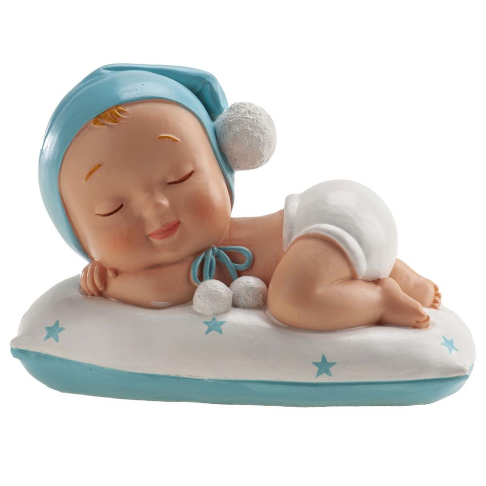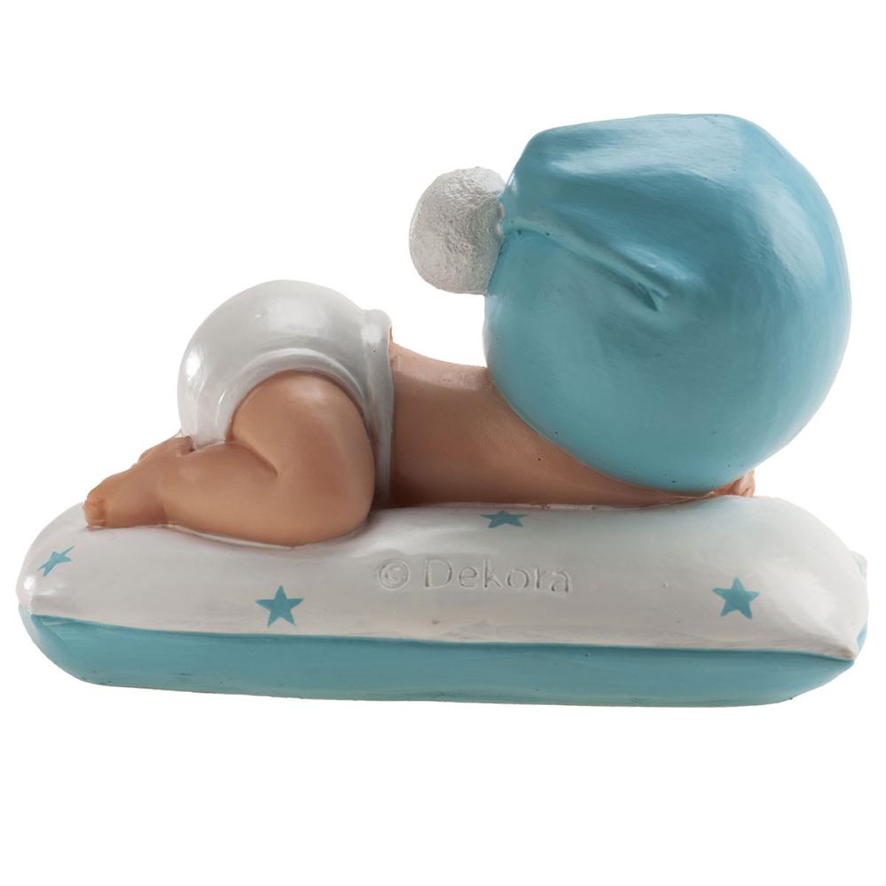 Kagedekoration Dåbsfigur Sovende Dreng omfatter en sød kagedekoration med lyseblå detaljer, der forestiller en sovende lille dreng med en PomPom. Denne charmerende dekoration er perfekt til dåb, navngivningsceremonier eller andre særlige højtider.
