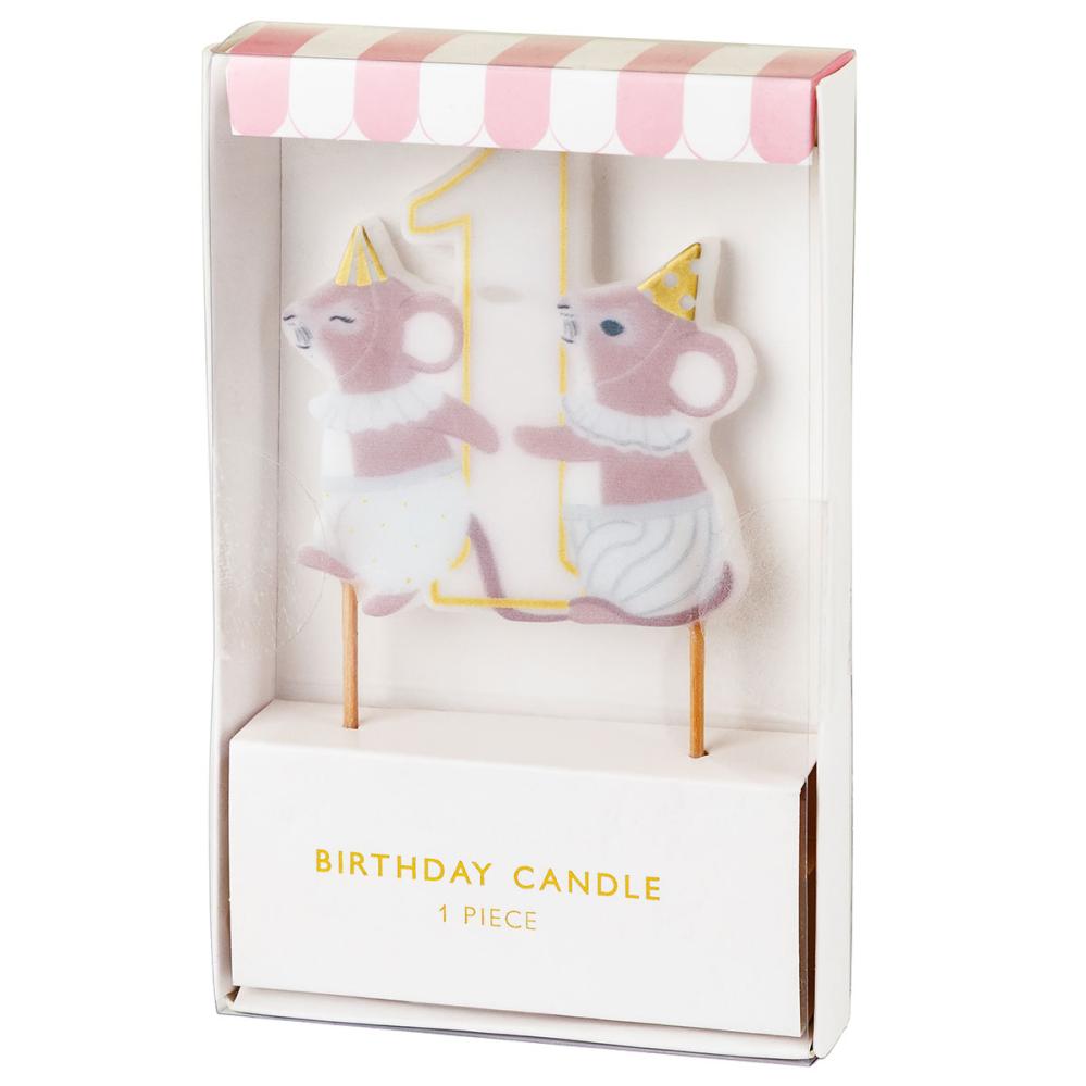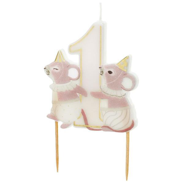 Et legesygt fødselsdagslys med tallet 1 passer, når 1 år fejres, og bliver en charmerende dekoration til den første fødselsdag. Dette kagelys, med musemotiv, løfter en 1 års fødselsdag og bliver et finurligt lys på enhver kage.