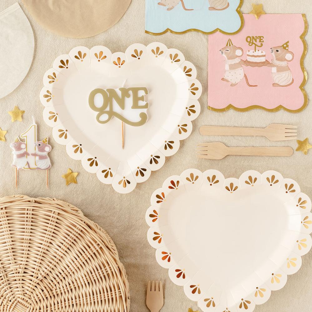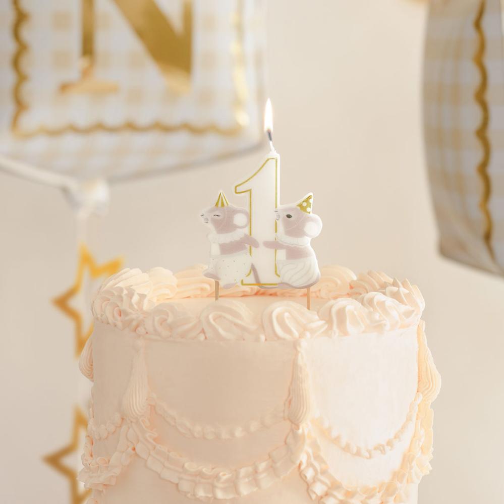 Kagelys 1 år Mus 6,5 x 7,5 cm består af et hvidt kagelys med beige og guldfarvede detaljer og forestiller to mus med festhatte, som bærer tallet "1". Lyset har to træpinde i bunden for nem placering i kagen.