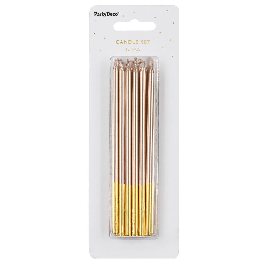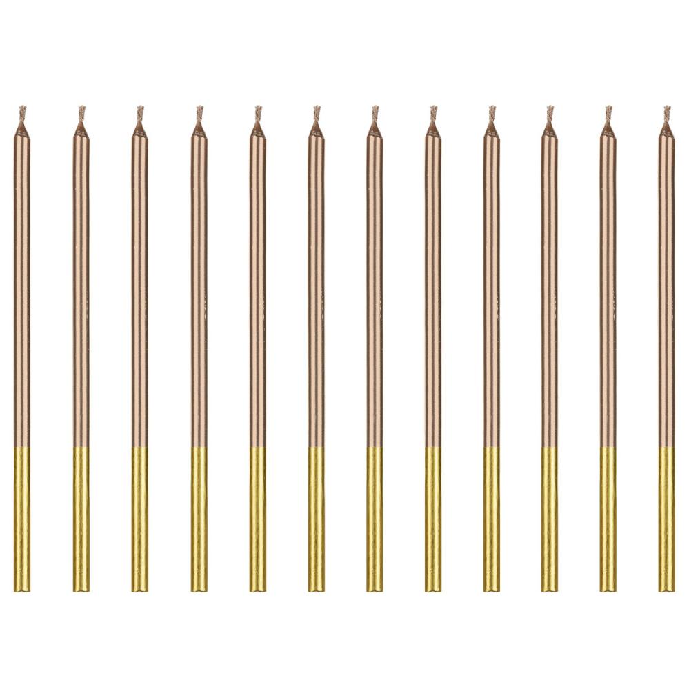 Kagelys Lange Roseguld 12-pak består af tolv tynde kagelys i roseguld.
