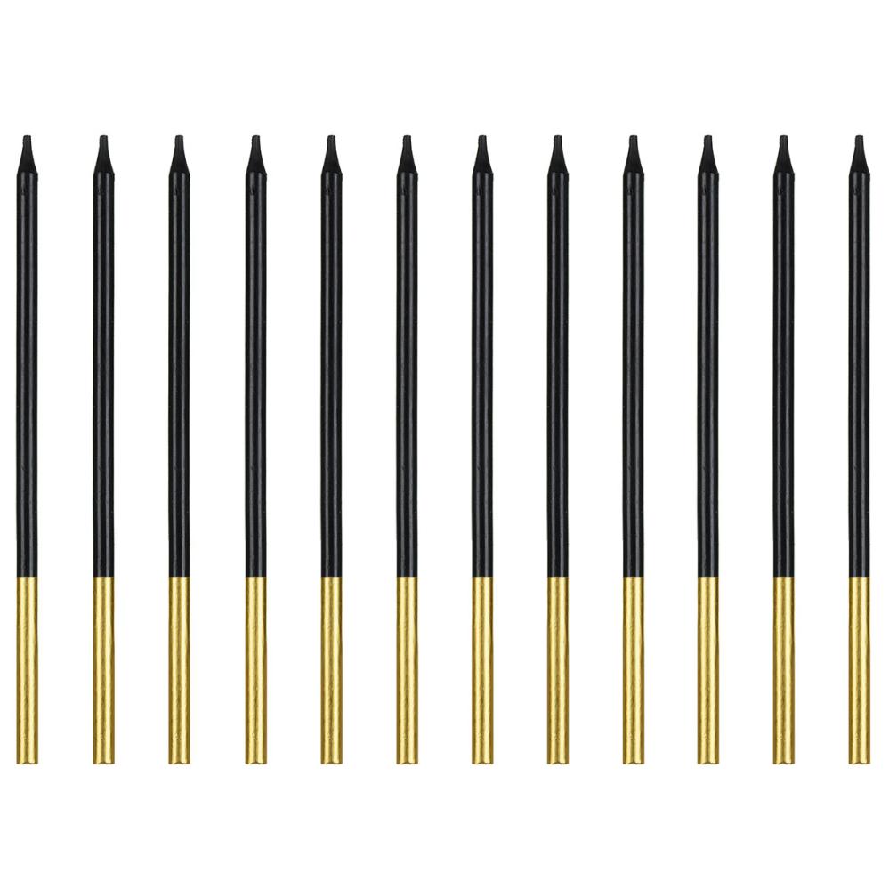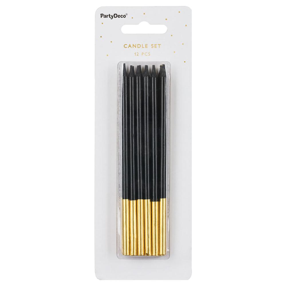Kagelys Lange Sort/Guld 12-pak består af tolv tynde kagelys i sort.