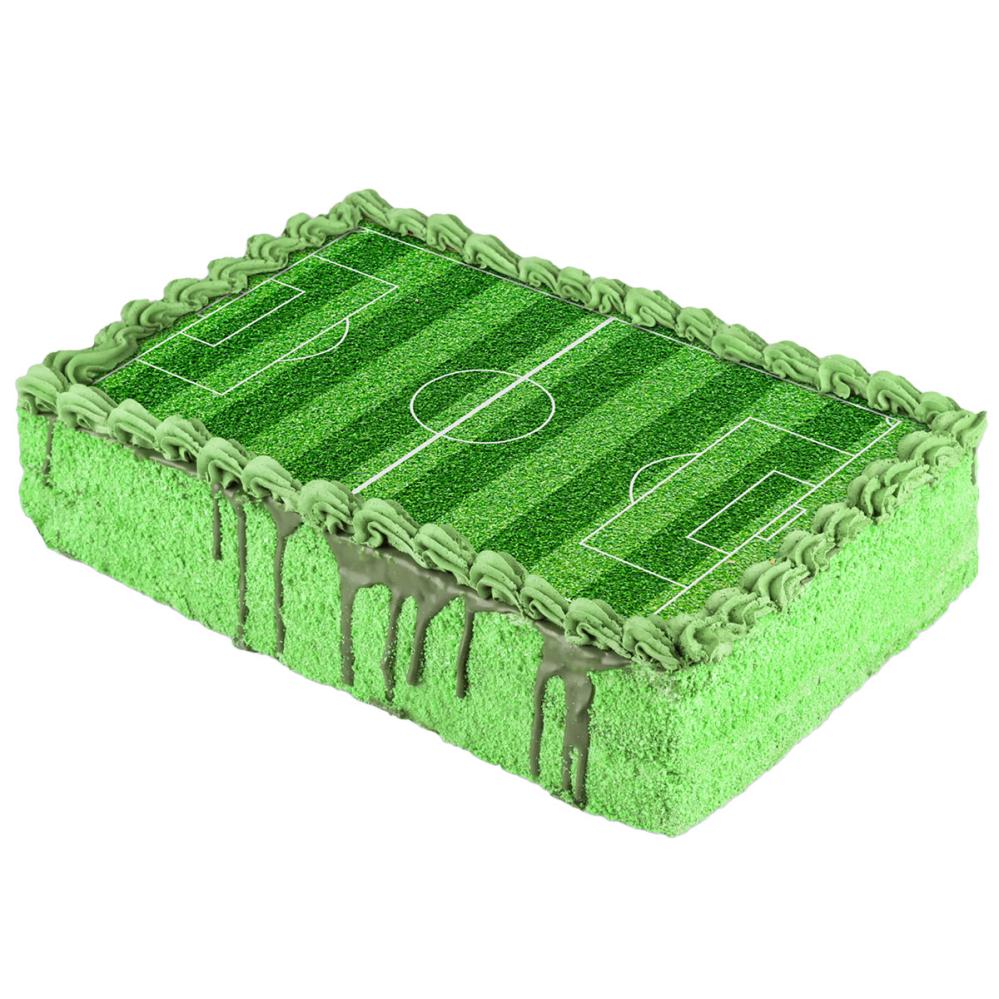 Fiks en træfsikker kagedekoration til børnefødselsdag med dette spiselige kageprint med motiv af en fodboldbane. Det rektangulære kageoblat passer perfekt til en fodboldfest og gør kagen både sjovere og mere personlig.