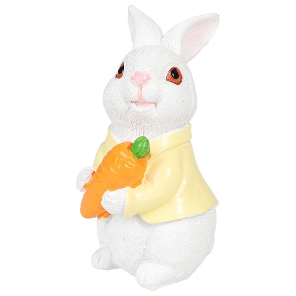 Kanin med Gulerod 5x10 cm er en påskedekoration i form af en hvid kanin, som holder en orange gulerod og bærer en gul blazer.