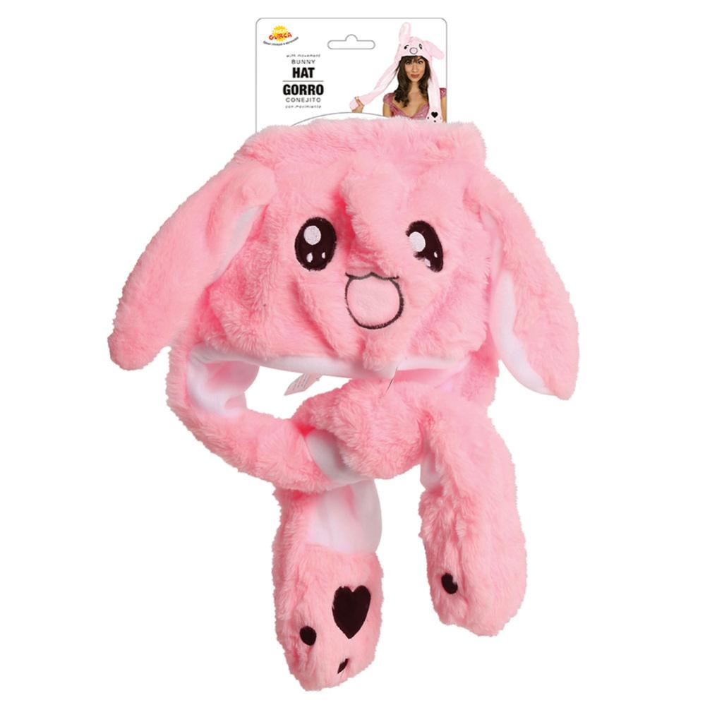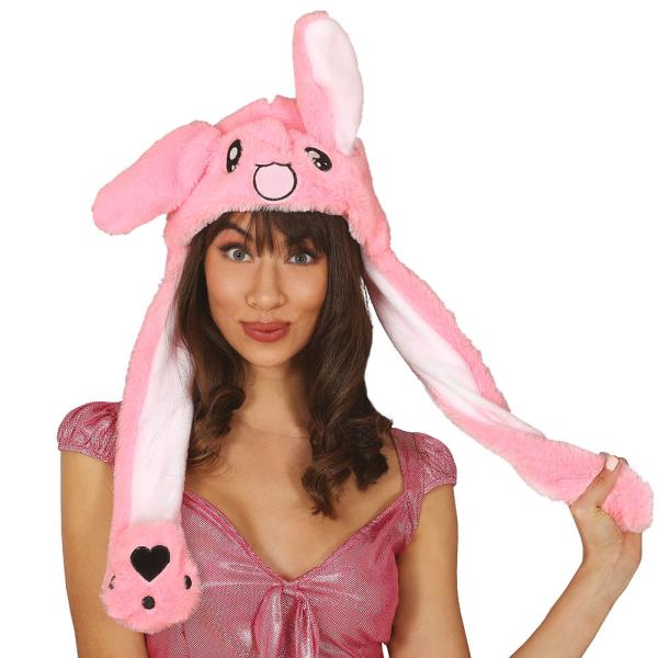 Kaninhue med Viftende Ører omfatter en kombineret børnehue og halstørklæde i form af en lyserød og hvid kanin. Når man trykker på kaninens poter, hopper ørerne op og ned.