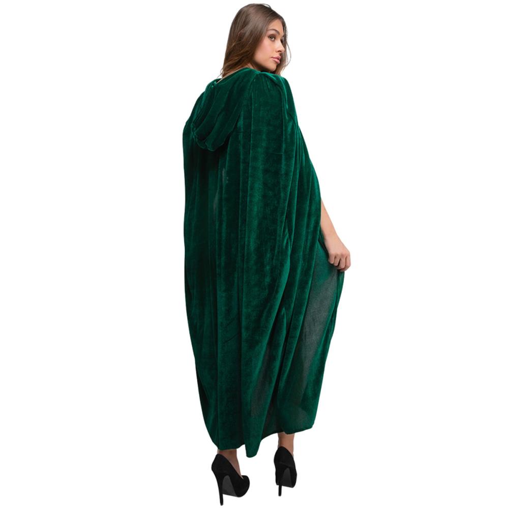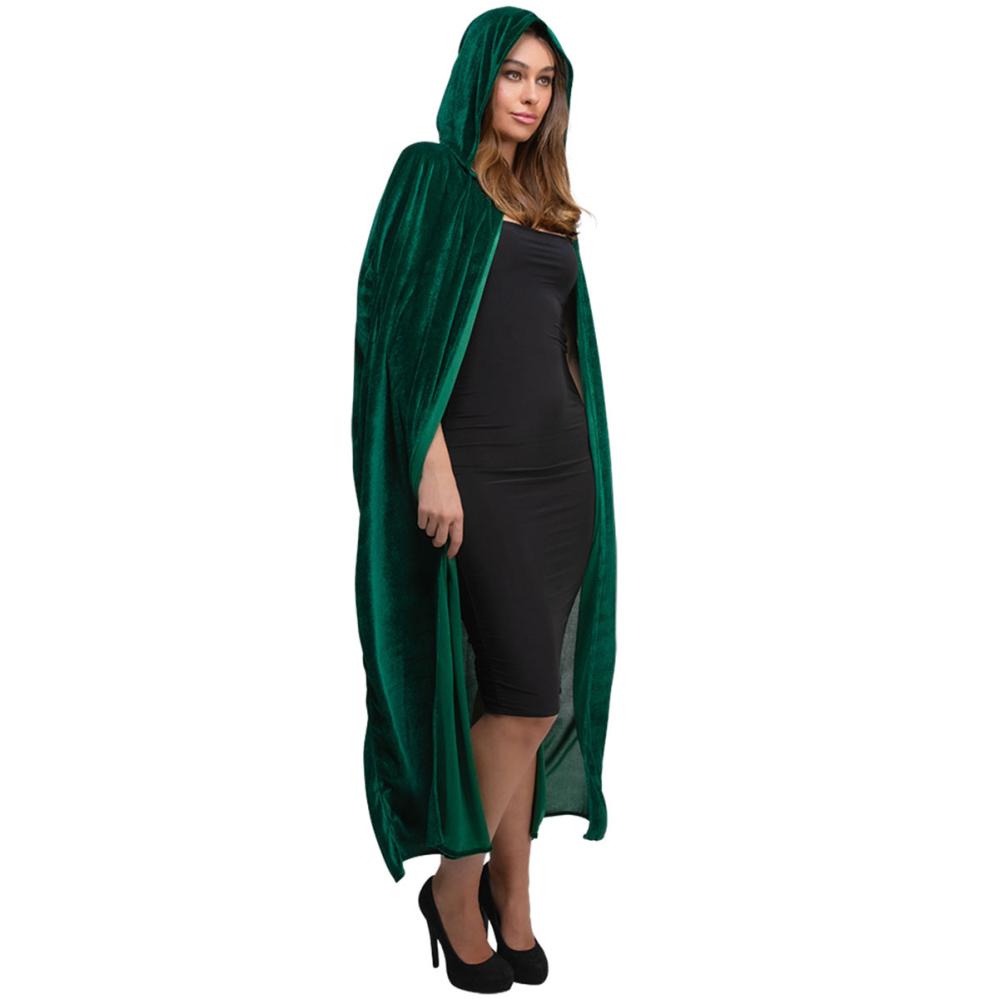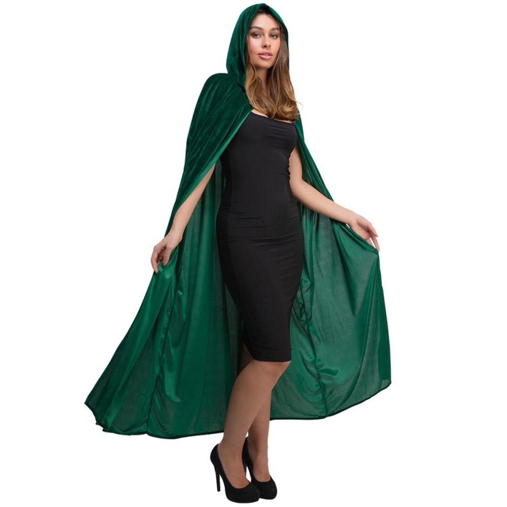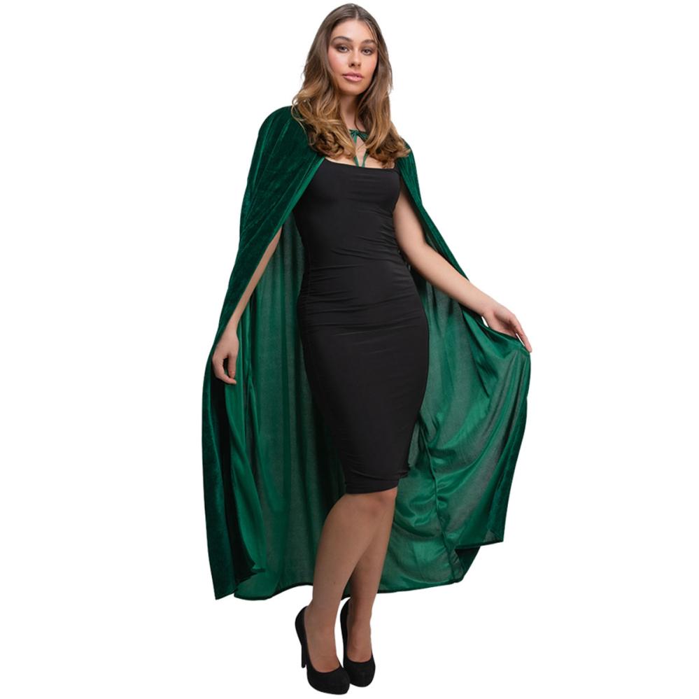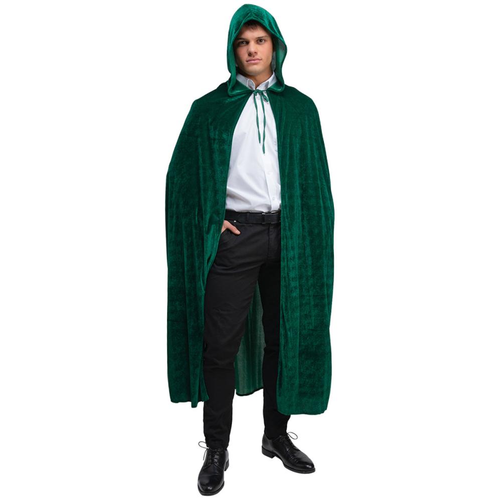 Skil dig ud fra mængden med en grøn Halloween kappe med hætte i fløjlslignende stof. En lang grøn kappe med bindebånd der passer perfekt som udklædningskappe til alt fra eventyr til gys.