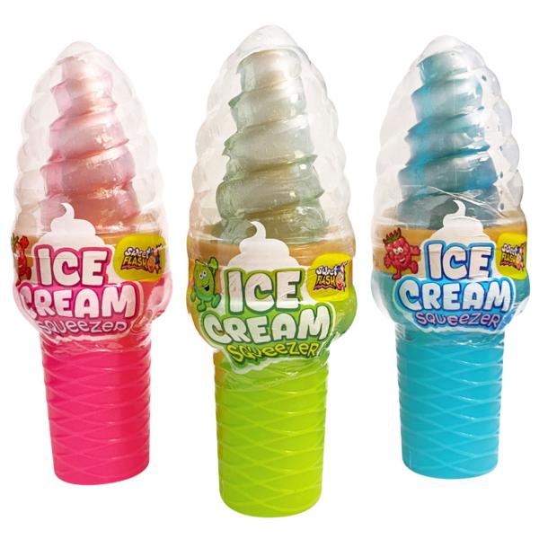 Karameller med Geléslik Isvaffel 52 g omfatter 52 gram karameller med geléslik i en plastemballage formet som en isvaffel i lyseblå, limegrøn eller rosa. Fås i smagene lime, hindbær eller jordbær.