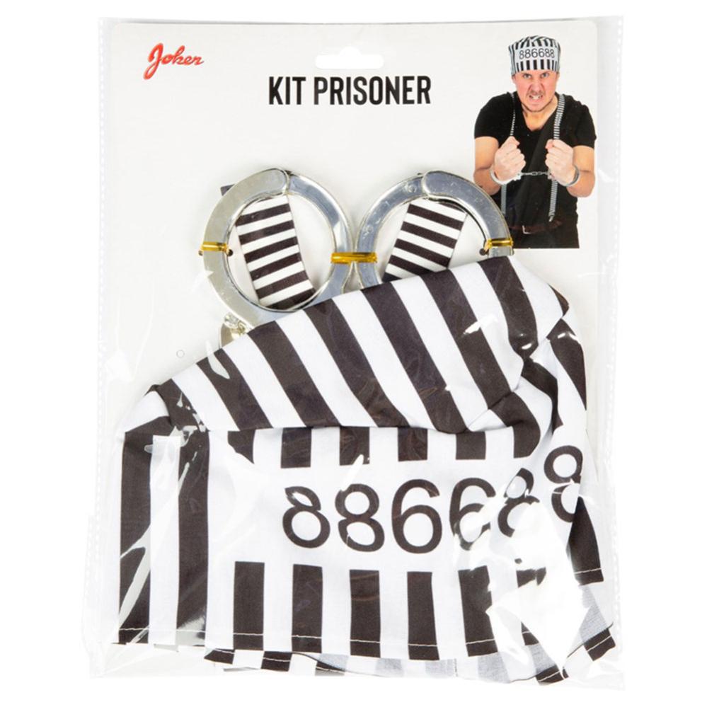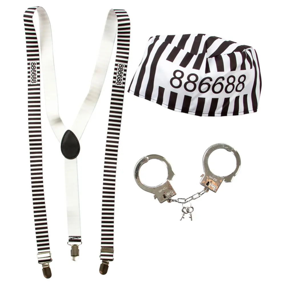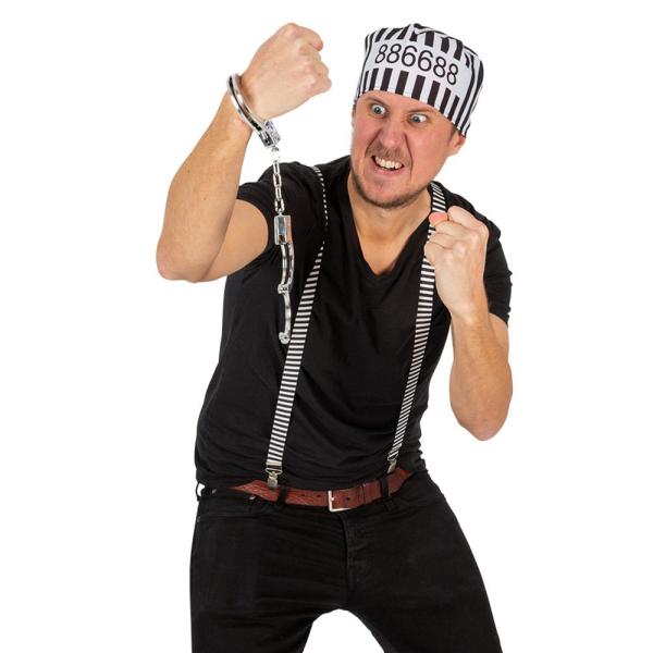 Karneval Tilbehør Fange er et kit med fange-tema, der inkluderer en sort-hvid stribet hue med nummer, håndjern og sort-hvide seler.