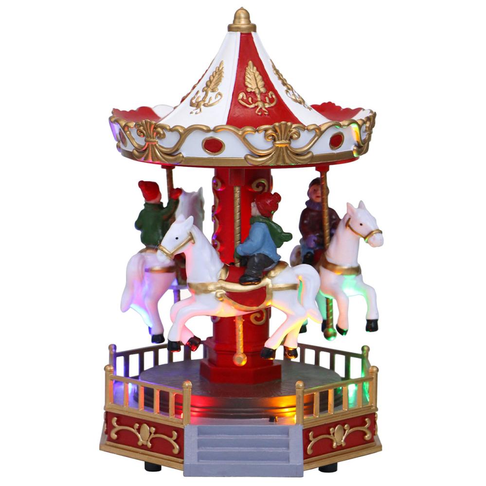 Karrusel Spilledåse med Julemusik og Lys omfatter en spilledåse i rød, hvid og guld, med en karrusel hvor tre hvide heste med figurer snurrer rundt til melodien af "Bjældeklang" mens fire små lamper i grøn, rød, blå og gul lyser op. Spilledåsen har en knap hvor du kan vælge om den skal snurre med eller uden melodi.
