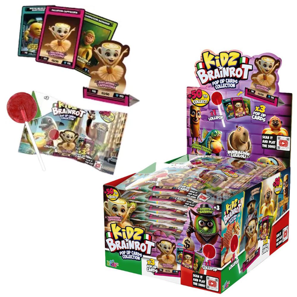 Kidz Brainrot Samlekort og Slikkepind er en pakke der indeholder en lækker slikkepind med frugtsmag samt tre holografiske samlekort med farverige og glitrende mønstre fra italienske Brainrot. Der findes over 50 forskellige kort at samle på og hver pakke indeholder en tilfældig blanding. Scan QR-koderne for at se og lytte til videoer.