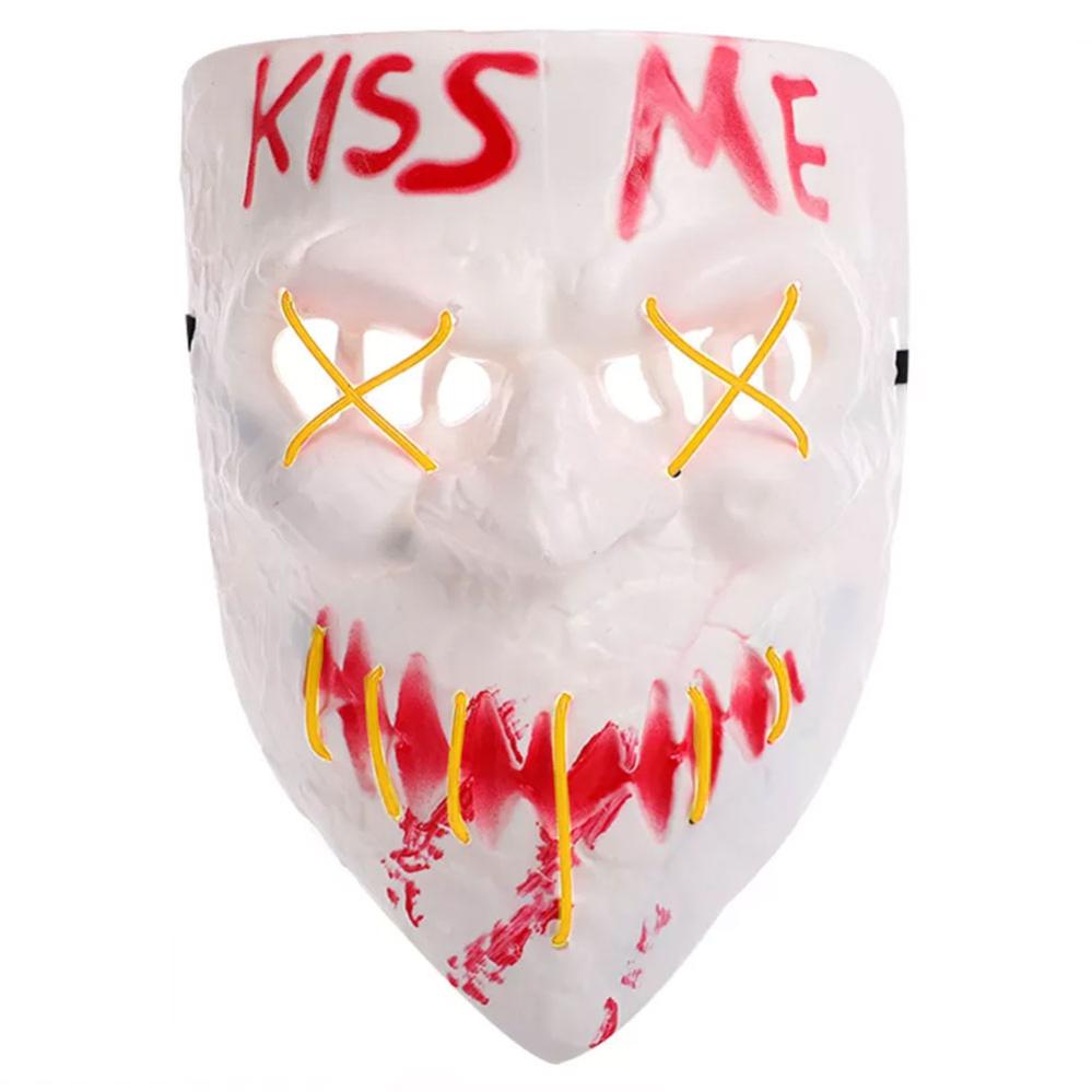 Vil du være en skræmmende skabning fra The Purge til Halloween-maskerade og fester? Så er denne uhyggelige og samtidig seje Kiss Me Maske med flot gult LED-lys noget for dig! En skræmmende maske, der giver dig den perfekte Halloween-udklædning og outfit til en uhyggelig fest i The Purge-stil.