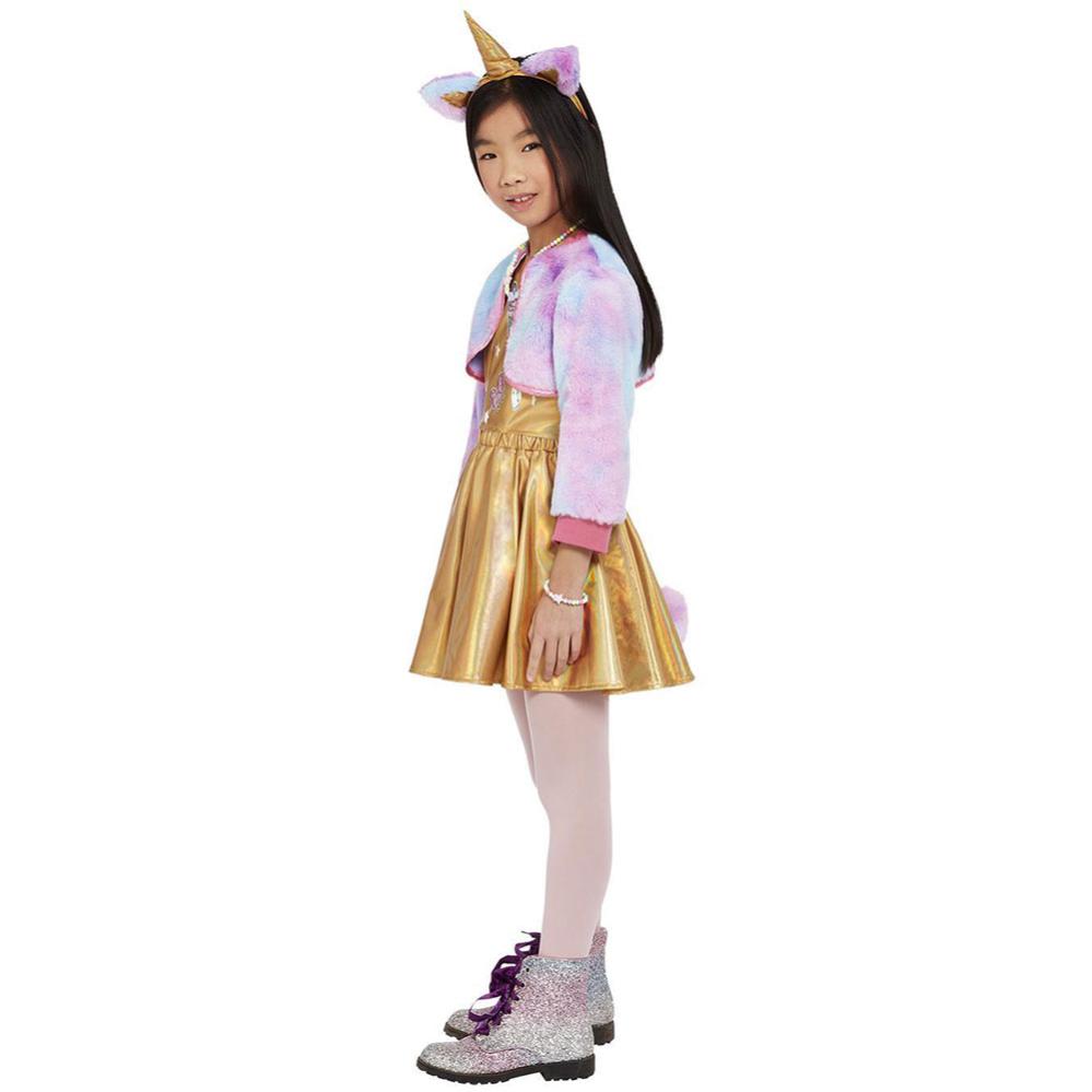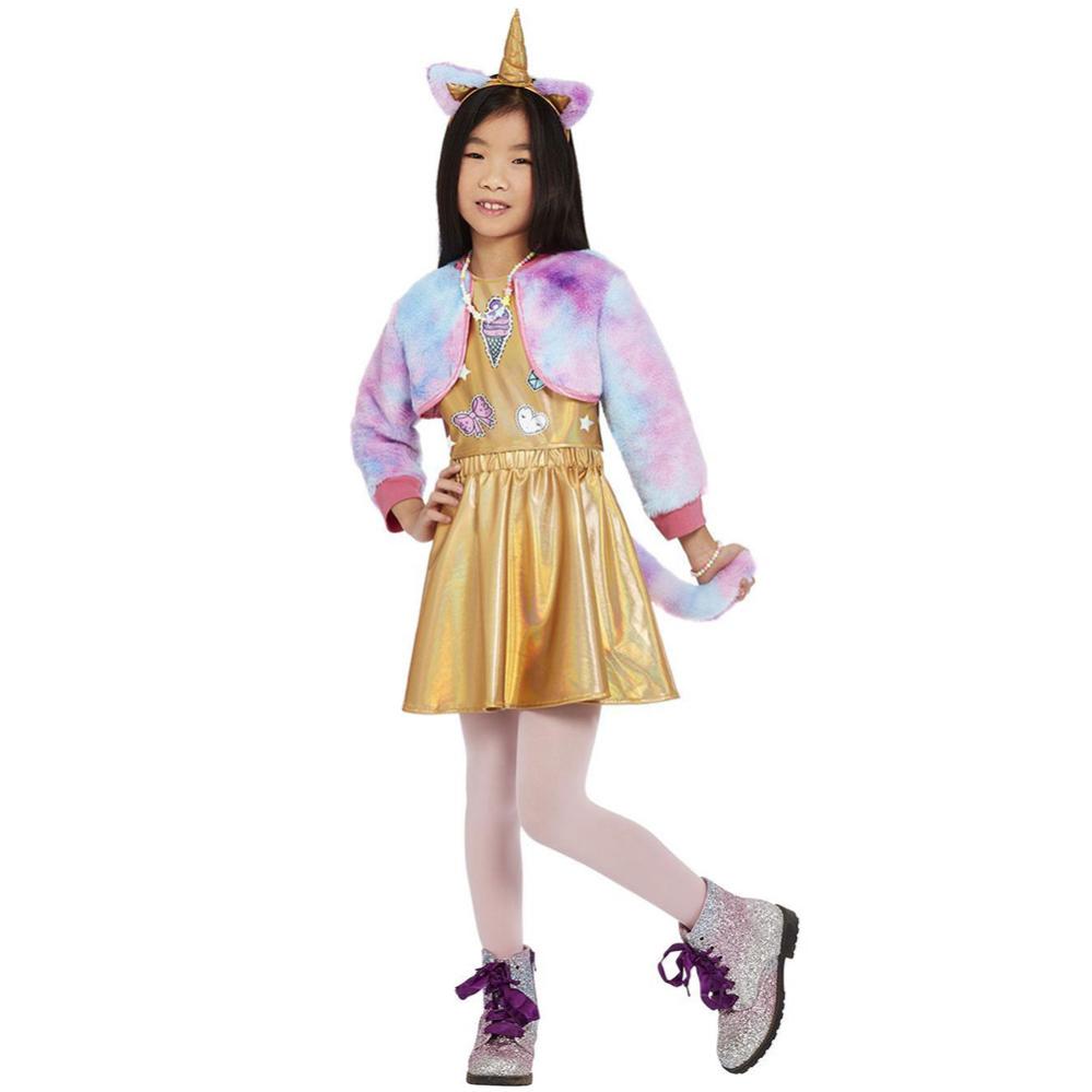 Kittycorn Kostume Børn omfatter en børnedragt med motiv af en kat og en enhjørning, deraf navnet 'Kittycorn'. Dragten består af en pastelfarvet bolerojakke, en guldfarvet kjole med søde motiver foroven, en pastelfarvet hale og et diadem med katteører og enhjørningehorn.