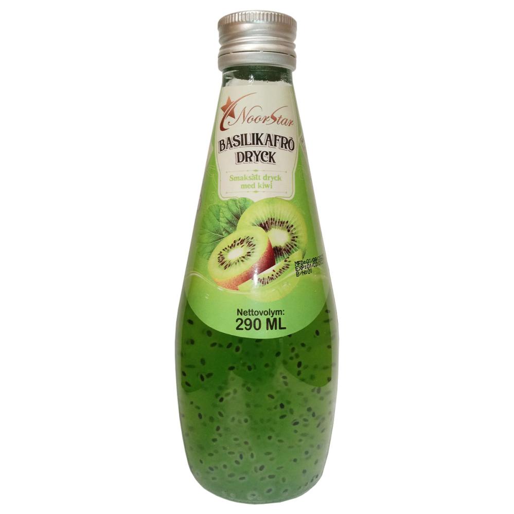 Kiwi-drik med Basilikumfrø 290 ml er en kiwidrik, der indeholder basilikumfrø i en 290 ml glasflaske med skruelåg.