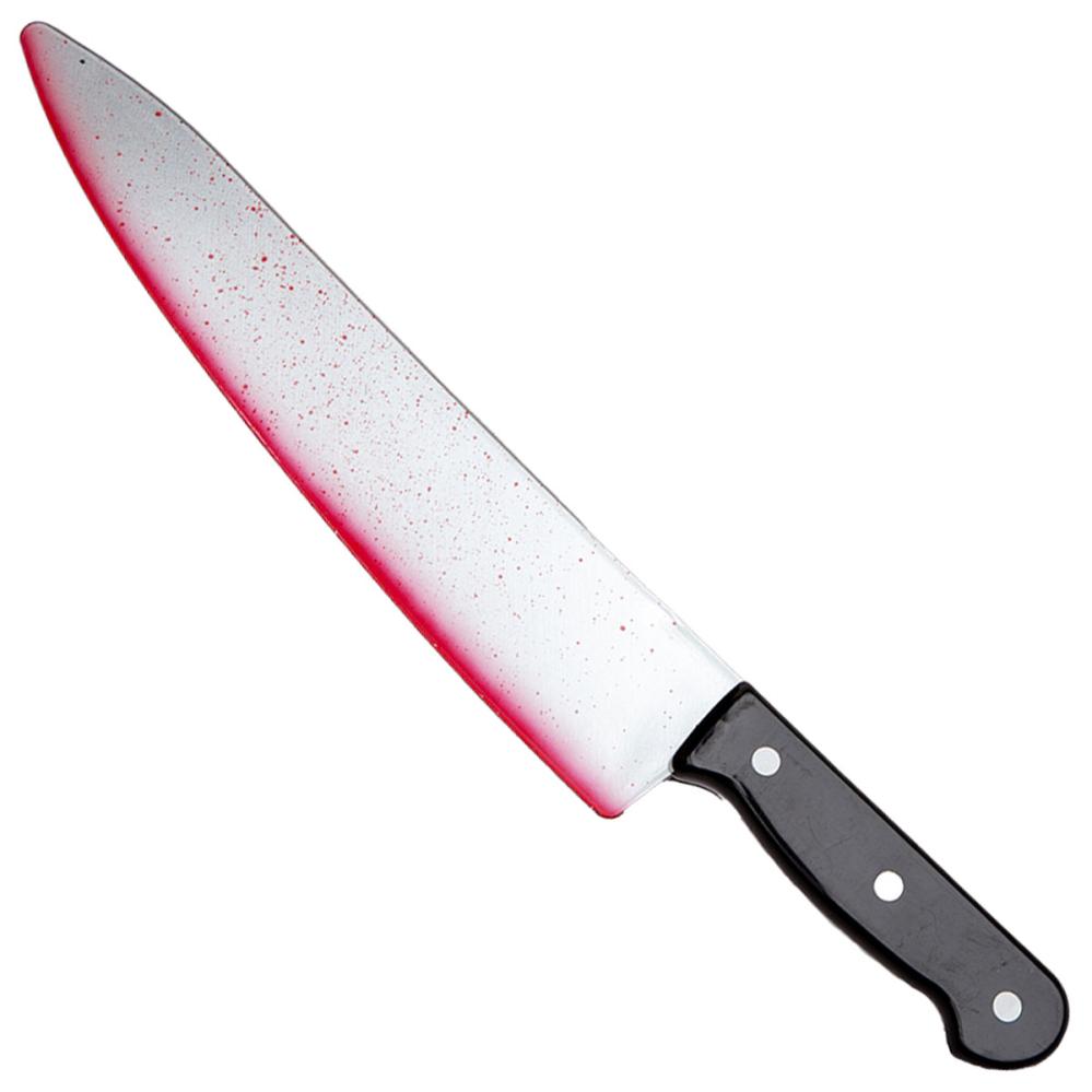 Køkkenkniv med Blodstænk omfatter en stor attrapkniv med både blodstænk på bladet og en blodig kant. Kniven har udseendet af en køkkenkniv med sit sølvfarvede blad og sorte skaft.