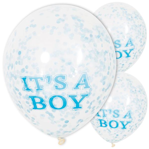 Konfetti Balloner It's a Boy består af en pakke balloner, der fyldes med konfetti, som medfølger i pakken. De kan også fyldes med helium eller luft. Teksten på ballonen lyder "It's a boy". Der medfølger en tragt til at fylde ballonerne med konfetti.
