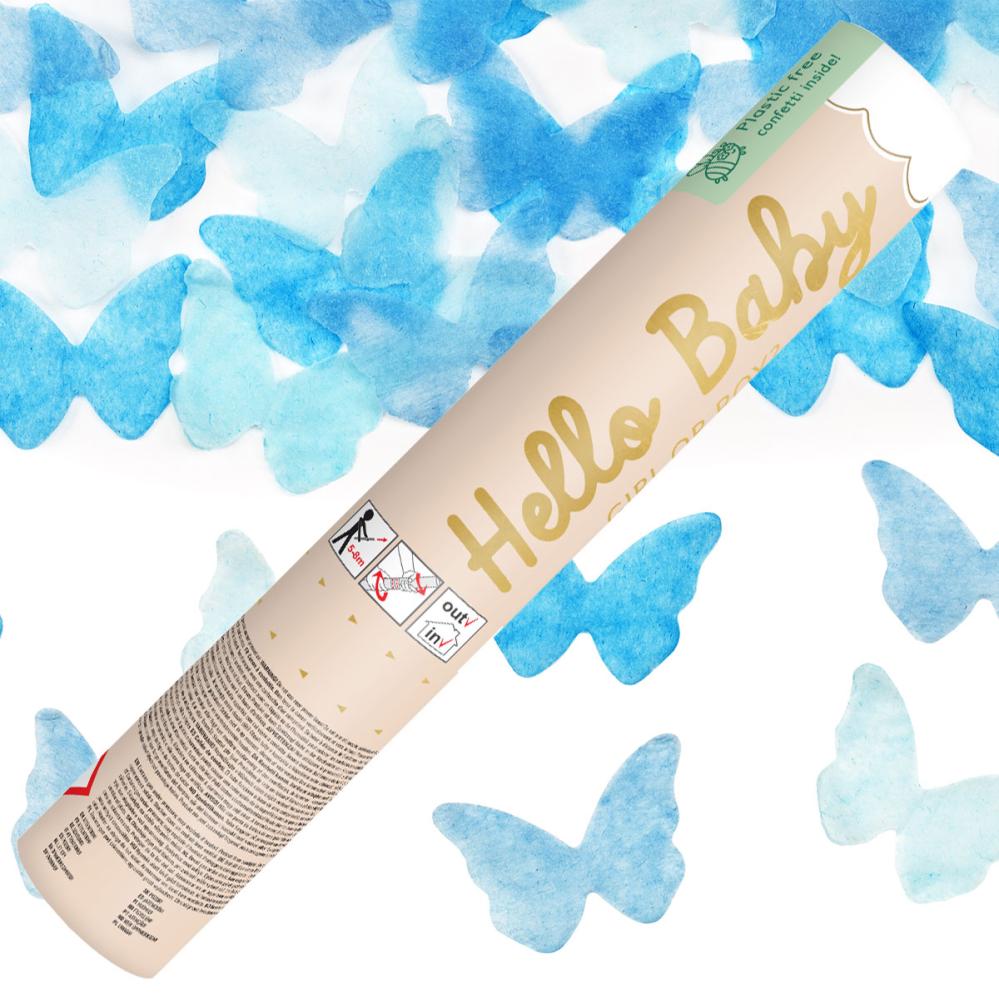 Med denne konfettikanon spredes konfetti som blå sommerfugle, hvilket gør din babyshower eller din gender reveal til mindeværdige øjeblikke. Designet med sommerfuglekonfetti giver enhver fejring en legende og farverig stemning.