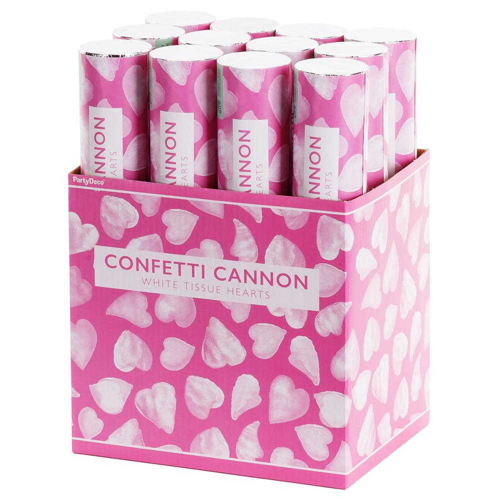 Ved dekoration til Valentinsdag eller bryllup skabes ekstra glæde med en konfettikanon fyldt med hjerter som spredes i luften. I konfettikanonen findes der hvid konfetti i form af hjerter som skaber en festlig stemning. Hjertekonfettien forstærker følelsen af fejring og romantik.