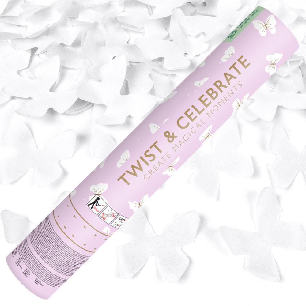 Info om Konfettikanon Hvide Sommerfugle 28 cm: