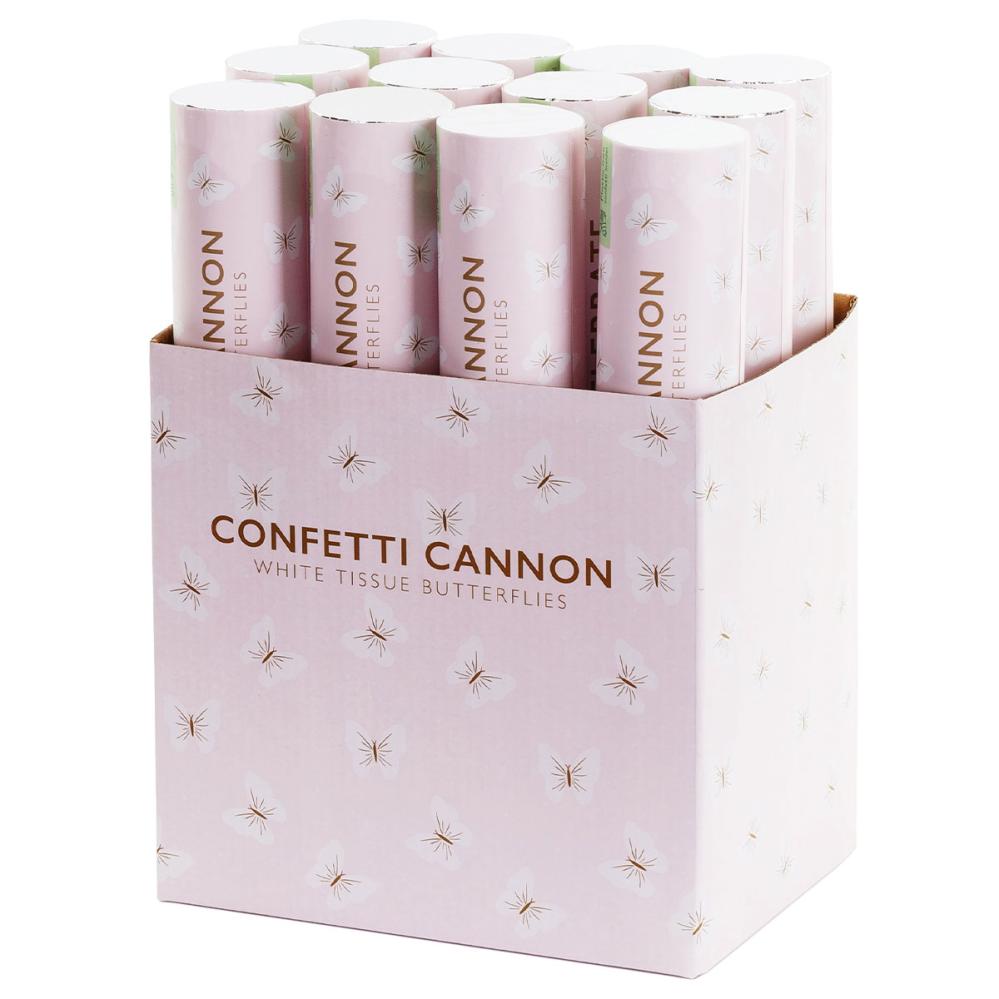 Når denne konfettikanon affyres, spredes konfetti i form af hvide sommerfugle i luften og skaber en festlig stemning. Ved festlige lejligheder skaber denne sommerfuglekonfetti et dekorativt højdepunkt som bidrager til en elegant atmosfære på festen.