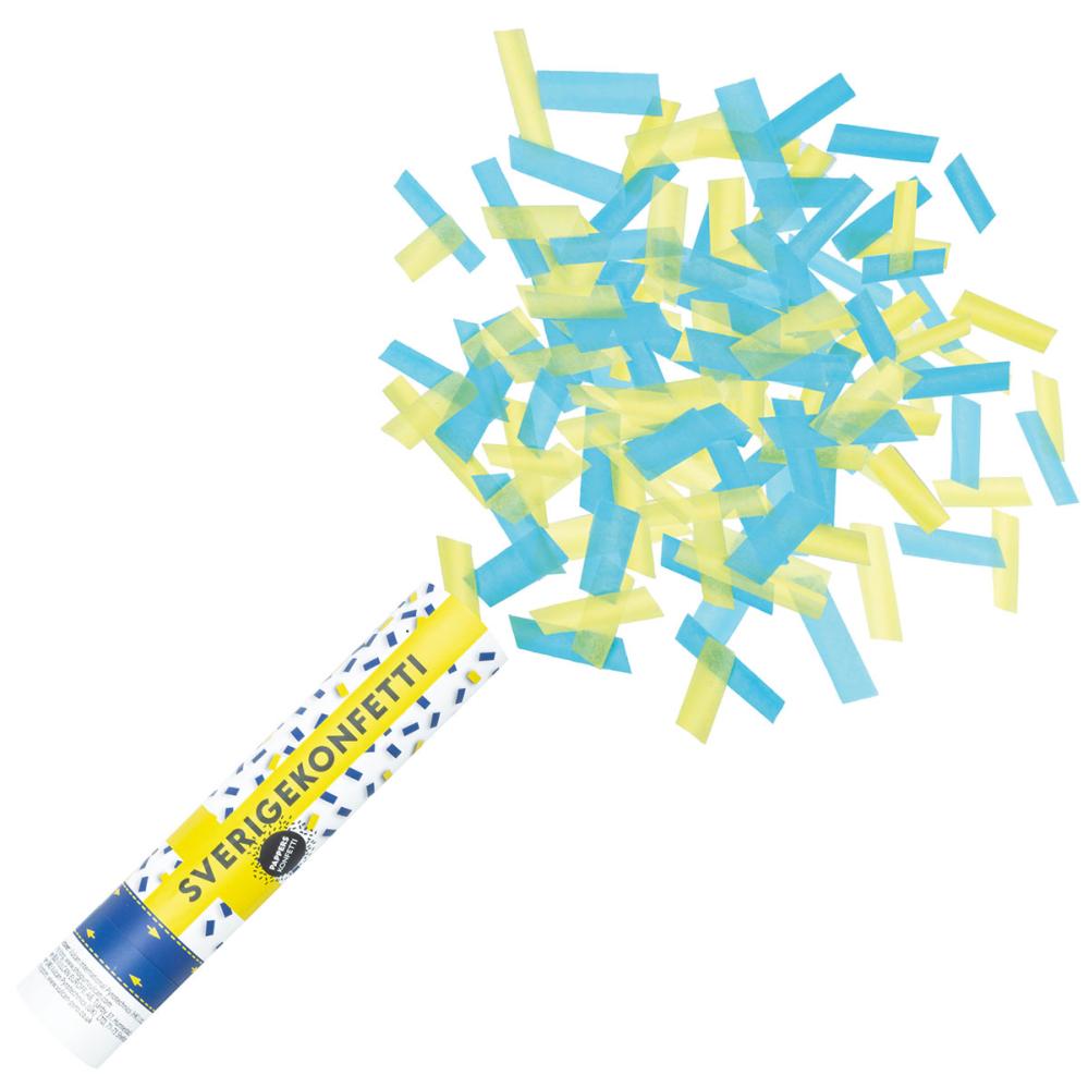 Konfettikanon Sverige 25 cm omfatter en konfettikanon, som skyder rektangulær papirkonfetti i blåt og gult ud, når kanonens nedre del drejes.