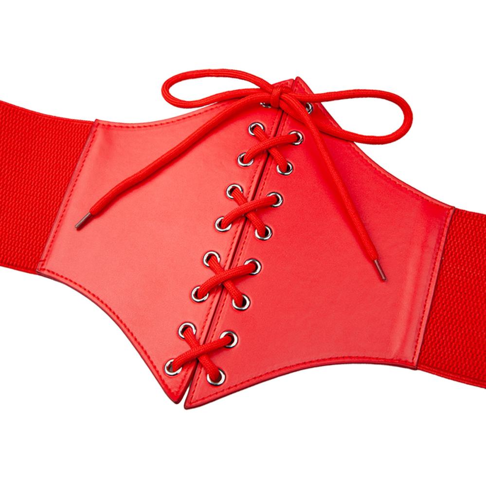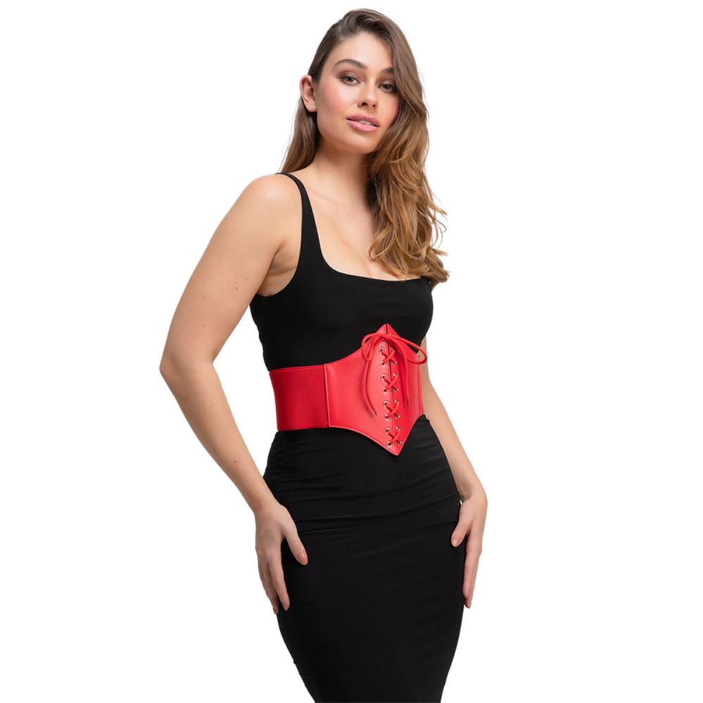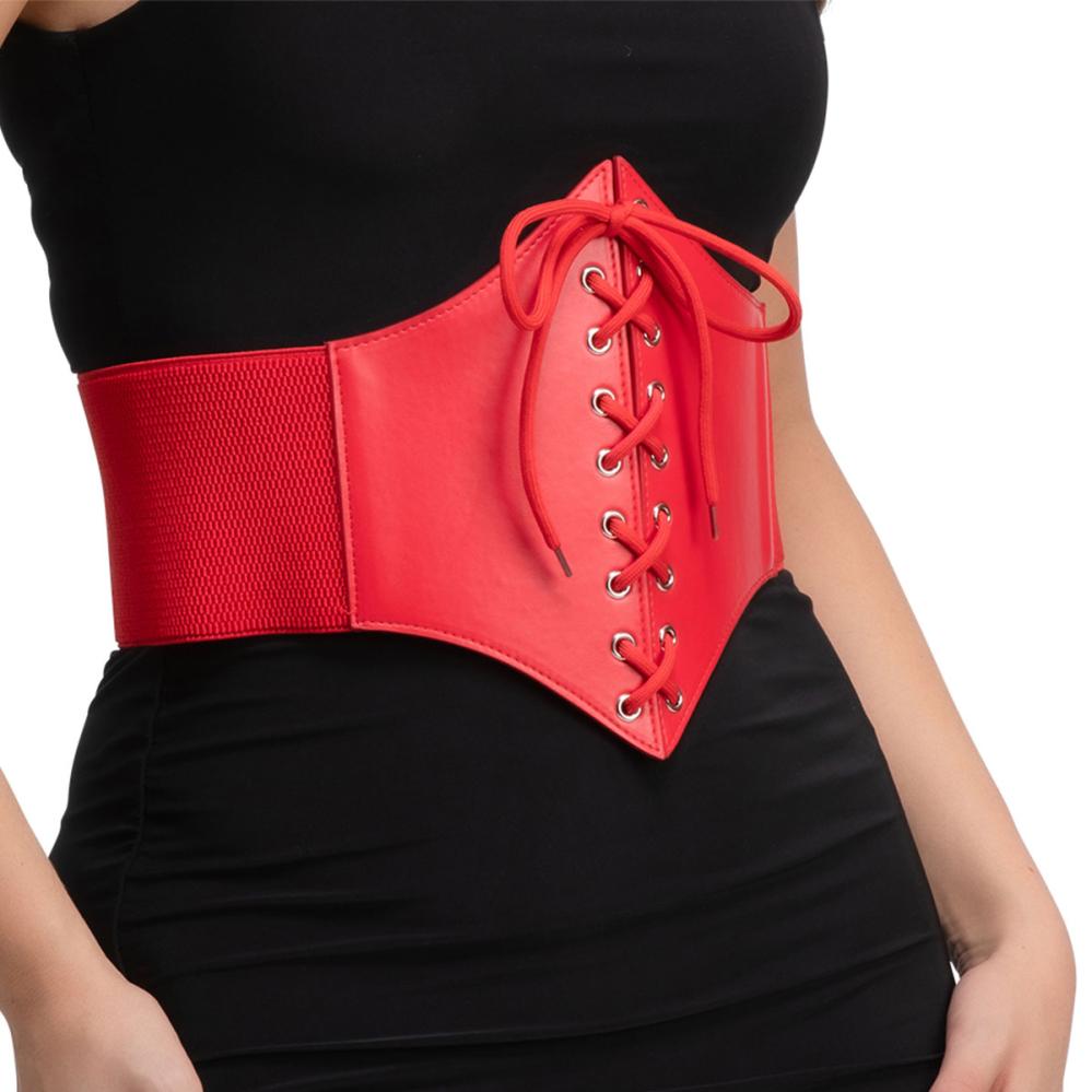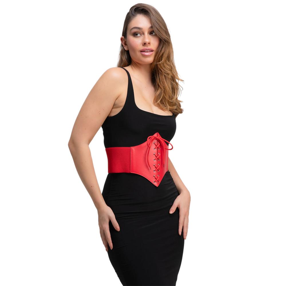 Korsetbælte Rød omfatter et justerbart rødt korsetbælte med snøring foran og trykknapper bagpå for nem lukning.