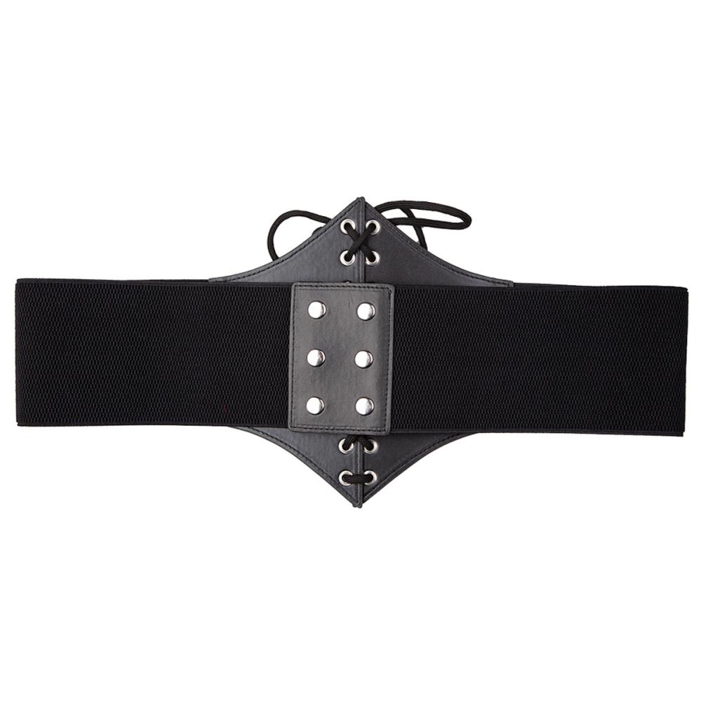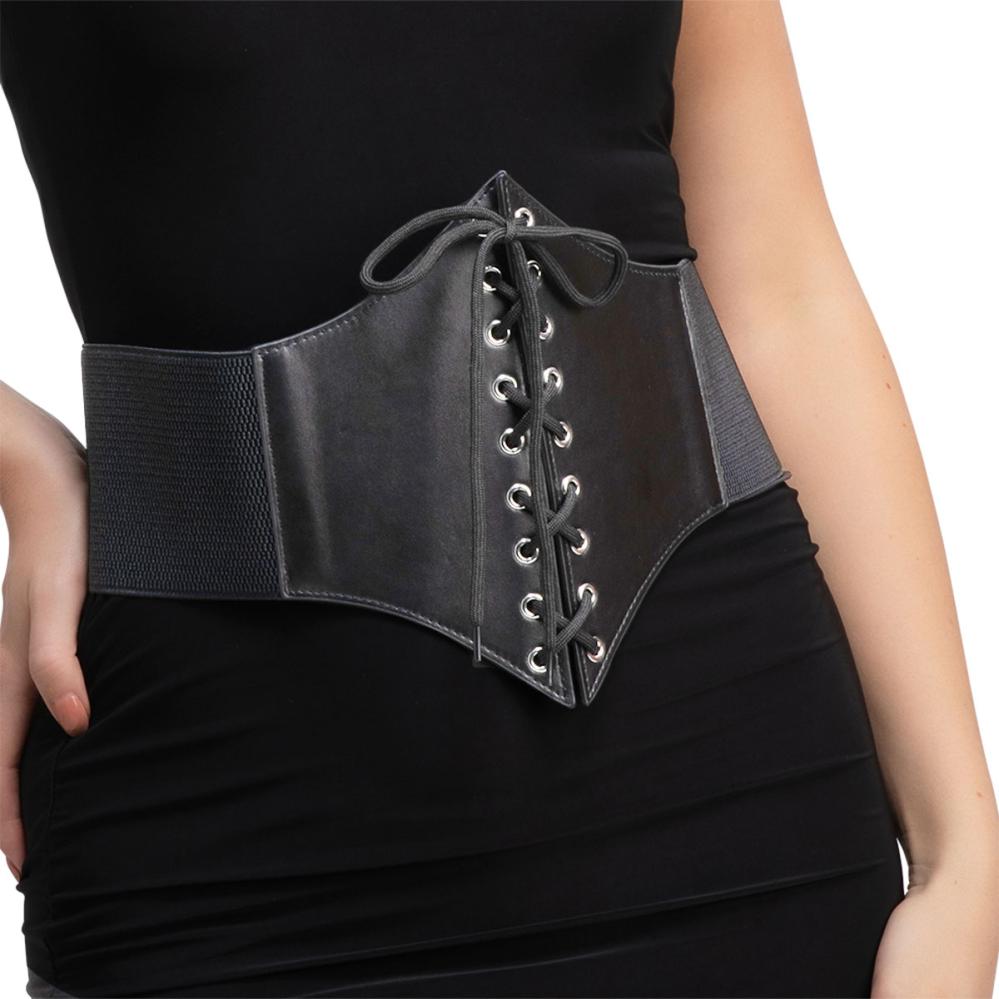Korsetbælte Sort omfatter et justerbart sort korsetbælte med snøring foran og trykknapper bagtil for nem lukning.