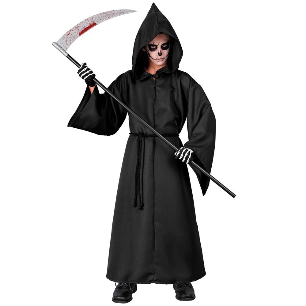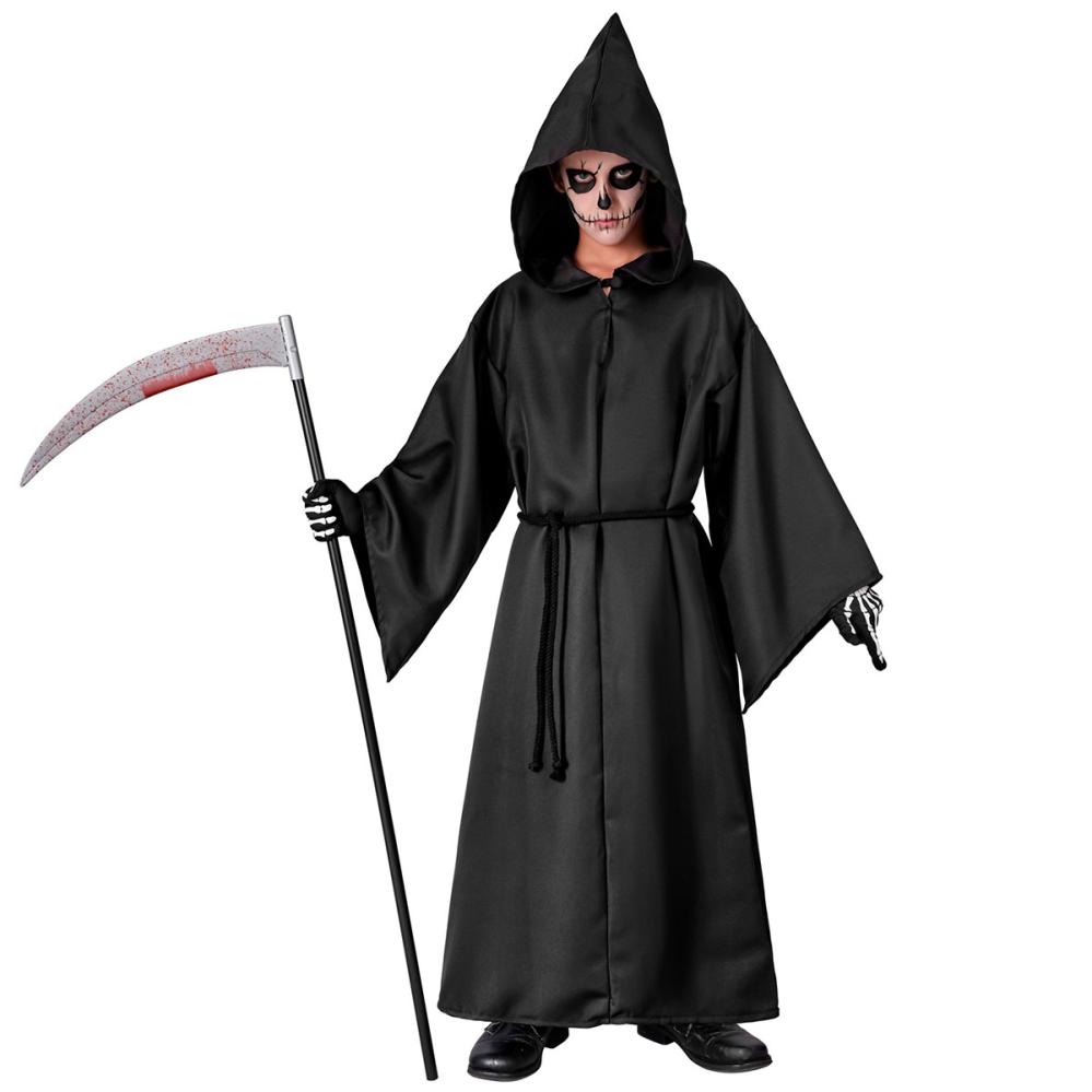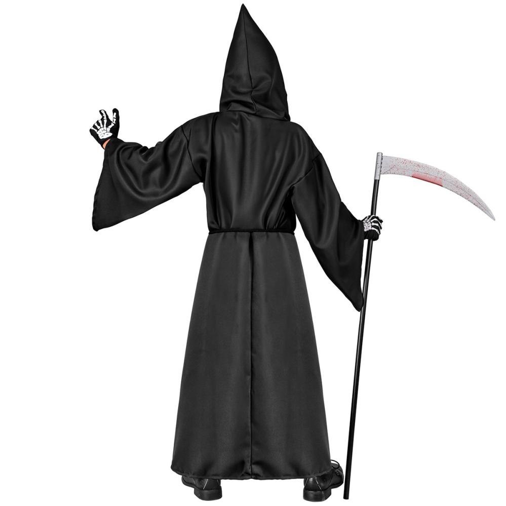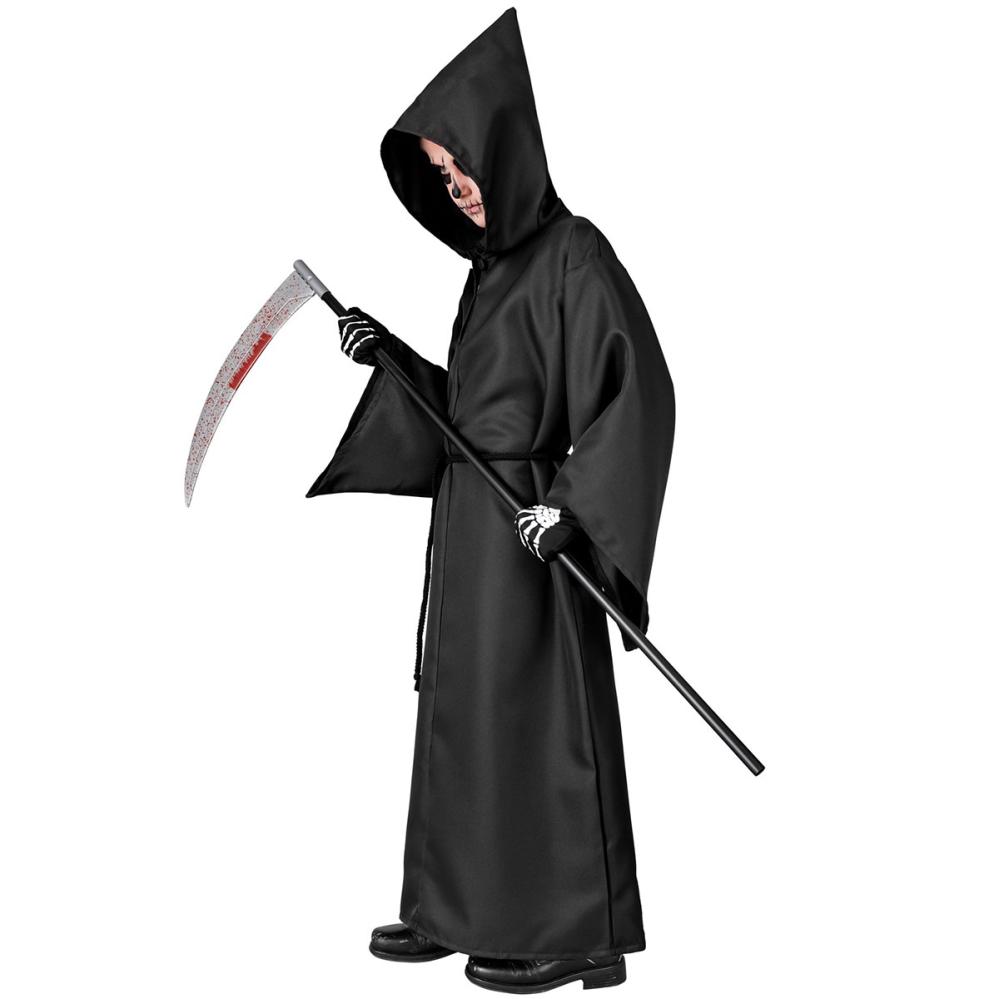 Kostume Manden med Leen Børn omfatter et sort kostume med motiv af manden med leen. Kostumet består af en tunika med hætte og et bælte af reb.