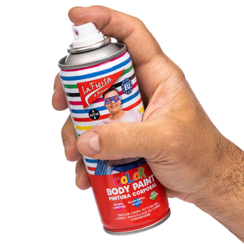 Kropsfarve Spray 200 ml består af en kropsfarve i sprayform, der kan vaskes af med varmt vand og sæbe.