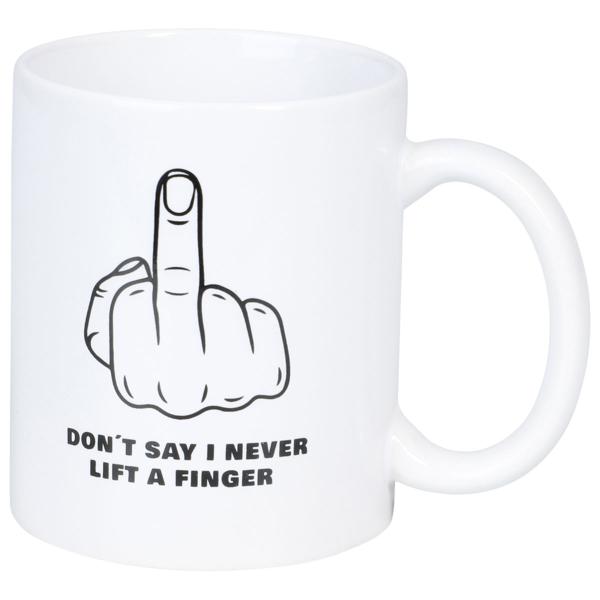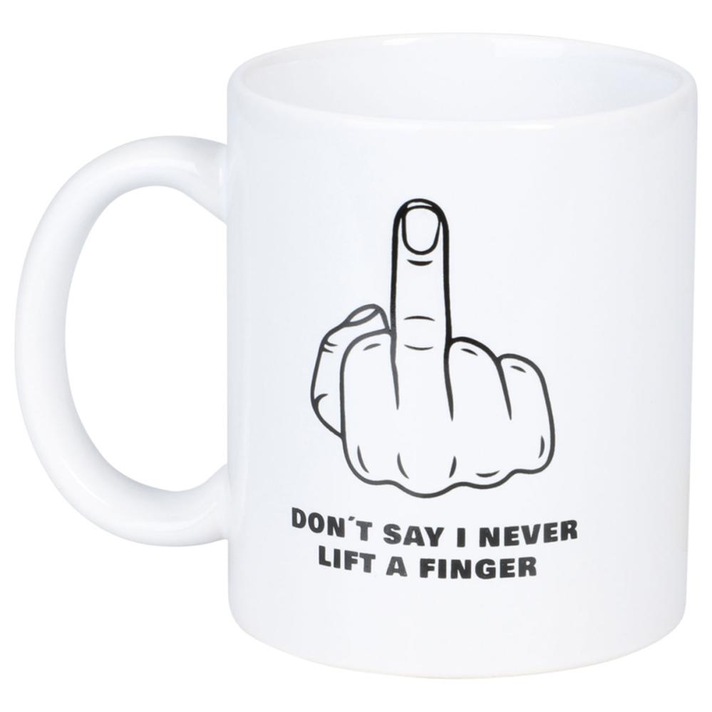 Krus Don't Say I Never Lift A Finger 300 ml er et hvidt porcelænskrus med sort tryk på begge sider, prydet med en humoristisk illustration af en hånd, der viser langefingeren, og teksten "Don't say I never lift a finger" nedenunder.