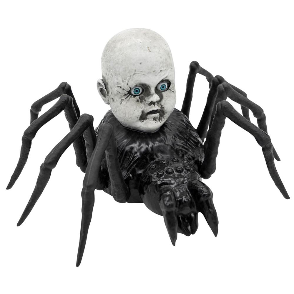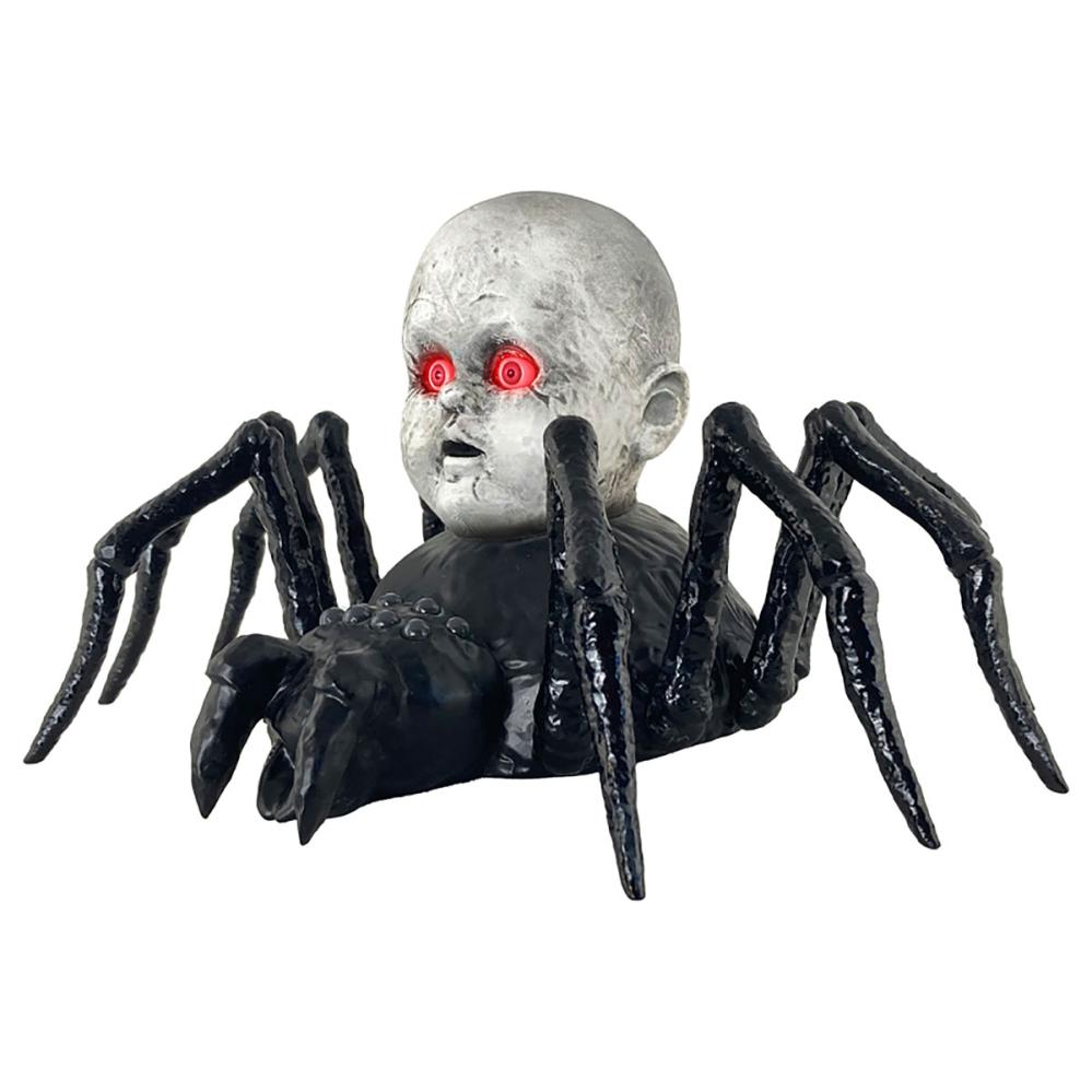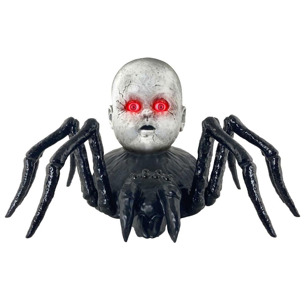 Krybende Edderkop med Dukkehoved Animeret Prop omfatter en stor sort edderkop med et uhyggeligt gråt dukkehoved på ryggen. Når den aktiveres begynder edderkoppen at krybe rundt, mens dukkens øjne lyser rødt. Tænd blot for strømafbryderen og klap i hænderne, så vågner denne mareridtsagtige skabning til live. Den bevæger sig hen over gulvet og afgiver uhyggelige edderkoplyde, som garanteret skaber en skræmmende stemning.