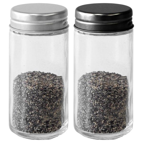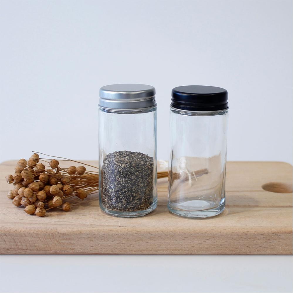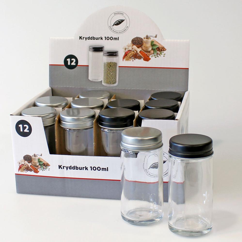 Krydderikrukke med Låg 4,4 x 9,5 cm omfatter en lille krydderikrukke i glas med et skruelåg i metal. Låget fås i to forskellige farver: sort og sølv.